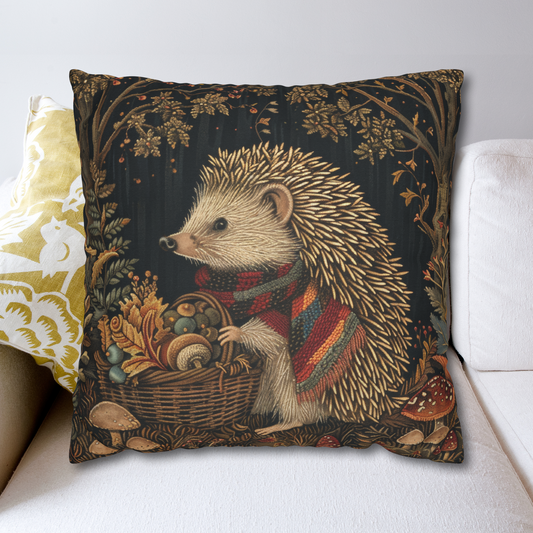 William Morris Inspired Hedgehog Gathering Fall Treasures Decorative Pillow | Vintage Cottage-core Pillow