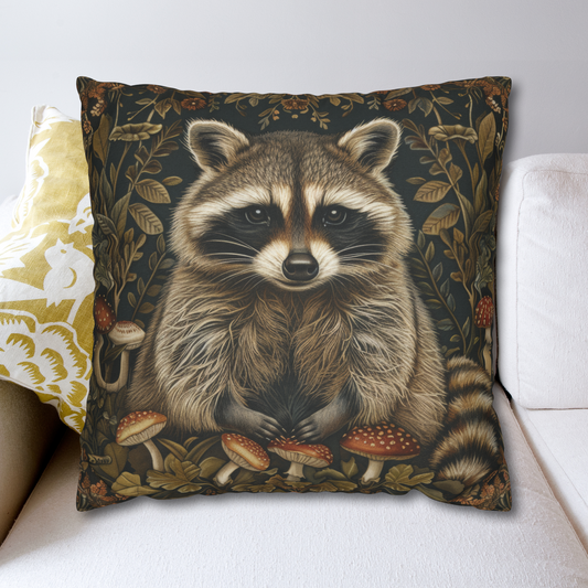 William Morris Inspired Woodland Raccoon Mushroom Decorative Pillow, Cottage-core Pillow