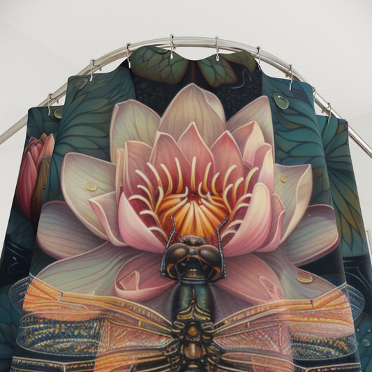 William Morris Inspired Dragonfly Pink Water Lily Shower Curtain | Art Deco Style Shower Curtain | Cottagecore Bathroom Decor