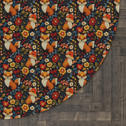 Embroidered Cute Foxes Round Rug, Fall Season Decor Carpet, Floral Pattern Area Rug
