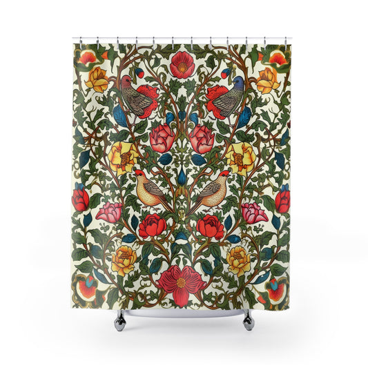 Vintage Pattern Rose And Bird in The Style of William Morris Shower Curtain | Art Deco Style Shower Curtain | Cottagecore Bathroom Decor