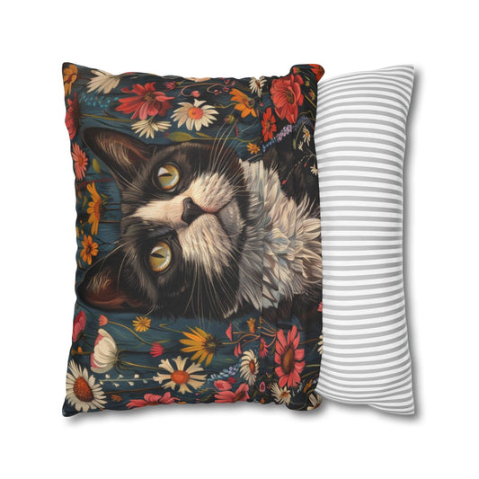 William Morris Inspired Botanical Tuxedo Cat Square Pillow | Cat Cottagecore Decorative Pillow
