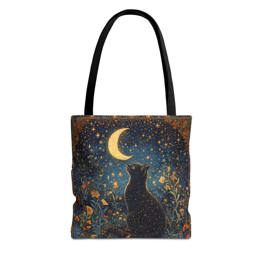Tote Bag - Black Cat Whimsical Night, William Morris Inspired, Cottage-core Eco-Friendly Carryall
