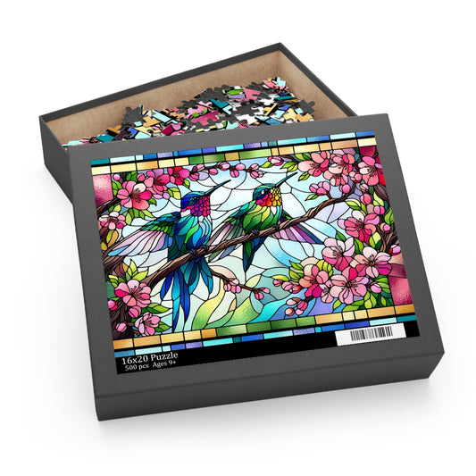Stained Glass Hummingbirds Spring Cherry Blossom Puzzle Box (120, 252, 500-Piece) Adult Jigsaw Puzzle, Gift Him Her