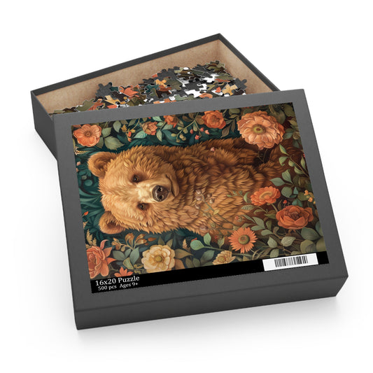 William Morris Inspired Brown Bear Wildflowers Puzzle Box (120, 252, 500-Piece) Family Jigsaw Puzzle, Puzzle Box Gift