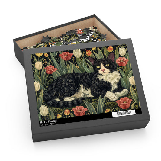 Tuxedo Cat Tulips Field in William Morris Style (120, 252, 500-Piece) Adult Jigsaw Puzzle, Gift Him Her