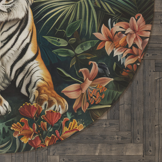 Tropical Tiger Round Area Rug | William Morris Inspired Cottage-core Decor, Housewarming Gift, Moody Woodland Round Carpet