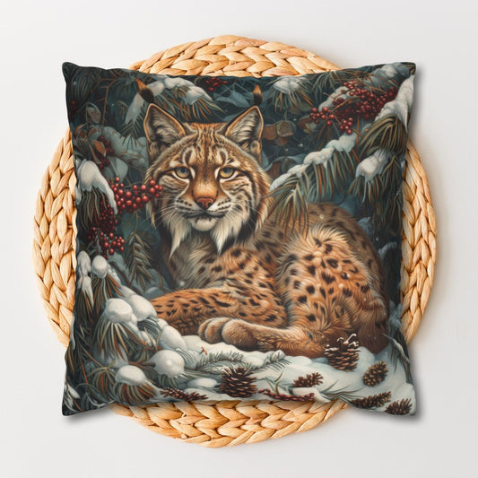 William Morris Inspired Snow Lynx Crouched Pillow | Cottage-core Decorative Pillow