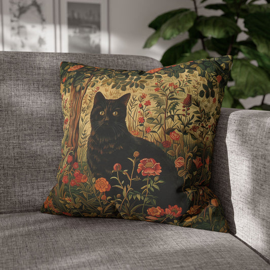 Vintage Black Cat Floral Garden Polyester Square Pillowcase, Art Deco Style Home Decor Pillowcase