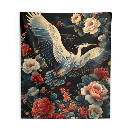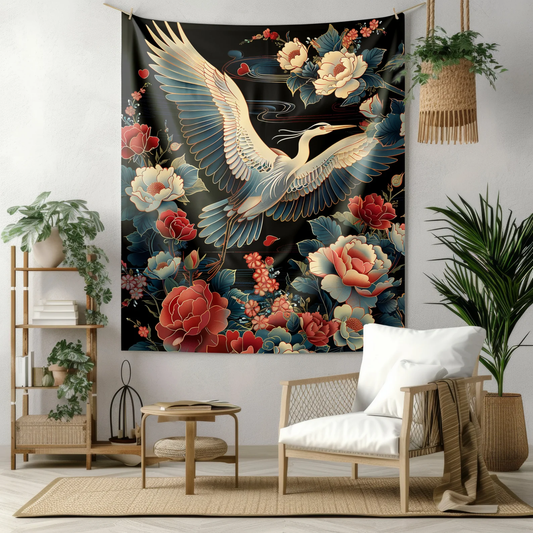 Tapestry of flying heron and Roses | Vietnamese Art Style Wall Art Tapestry | Cottagecore Hanging and Home Decor