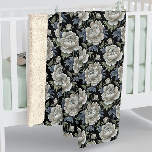 William Morris Inspired Vintage White Peony Classic Pattern Sherpa Blanket, Home Decor, Cozy Throw, Winter Gift, Living Room Accent