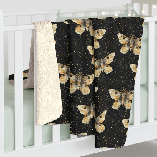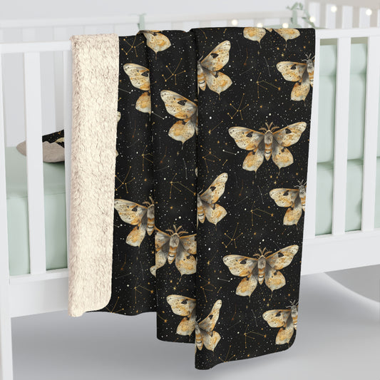 Gold Night Moths Celestial Stars Fantasy Art Vintage Style Sherpa Blanket, Cozy Home Decor, Soft Throw, Gift for Her, Winter Blanket,