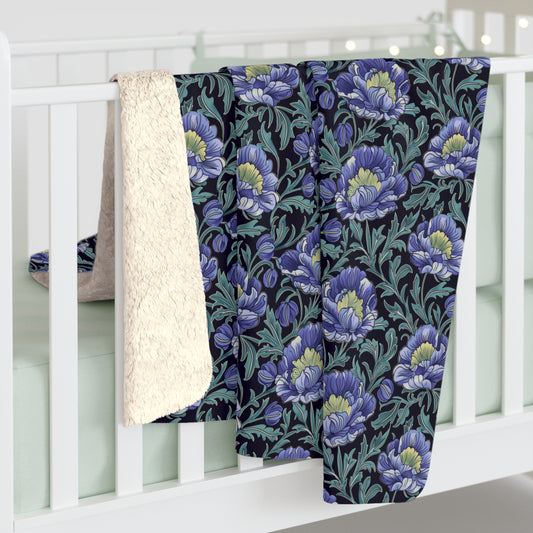 Embroidered Blue Purple Floral Sherpa Blanket, William Morris Floral Pattern, Cozy Throw, Unique Home Decor, Gift for Nature Lover