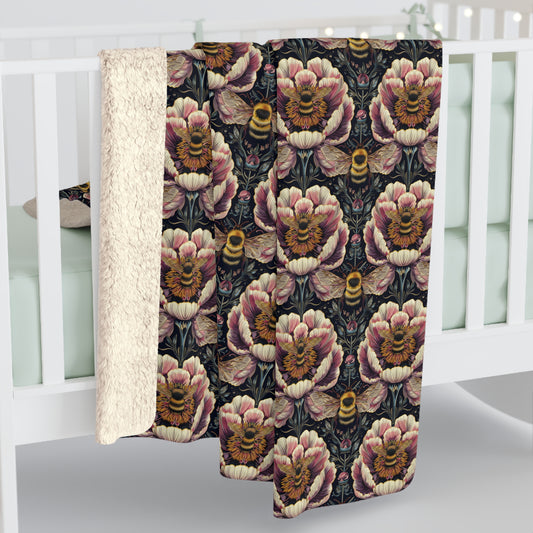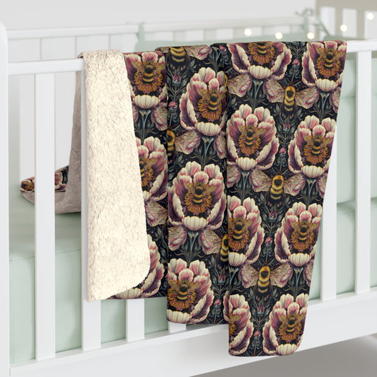 Bumblebee Peony Floral Art Vintage Style Sherpa Blanket, Cozy Home Decor, Soft Throw, Gift for Her, Winter Blanket,