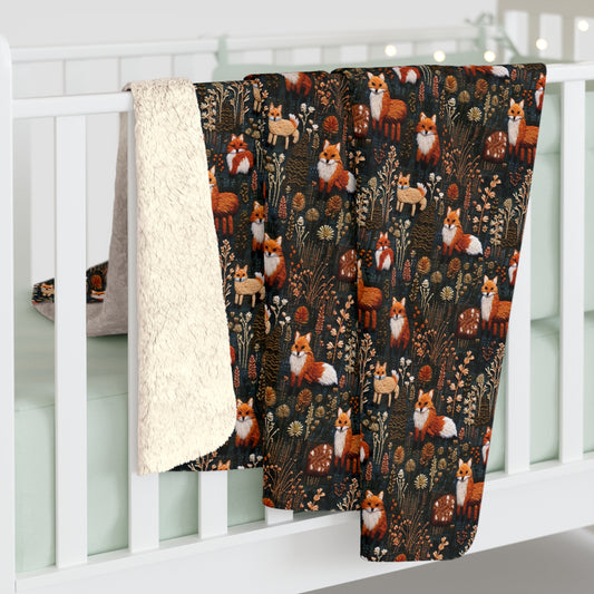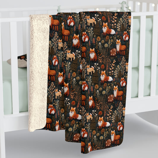 Woodland Foxes Embroidery Sherpa Blanket - Cozy Forest Animal Pattern Throw, Soft Fleece Bedspread, Rustic Home Decor, Gift for Nature