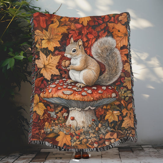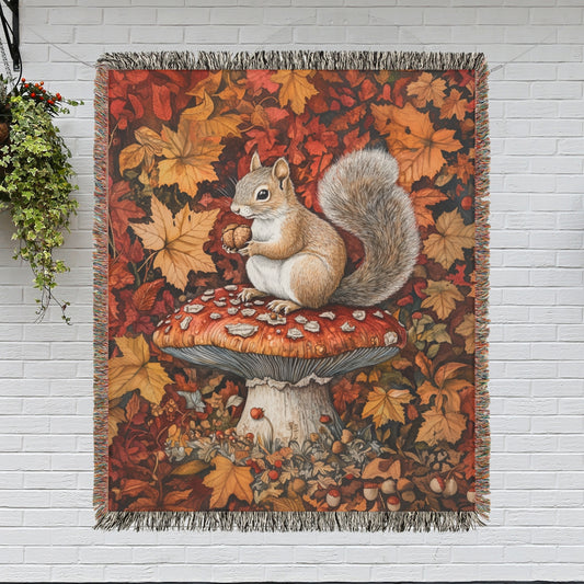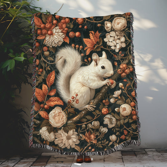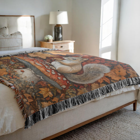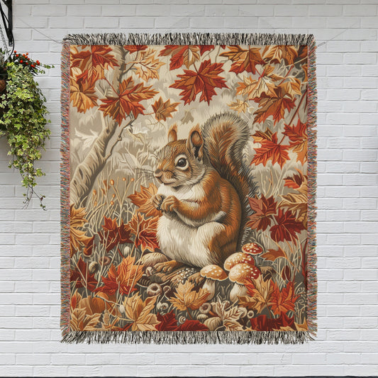 William Inspired Woodland White Squirrel Fall Autumn Forest Woven Blanket, Cozy Fall Home Decor Cotton Blanket