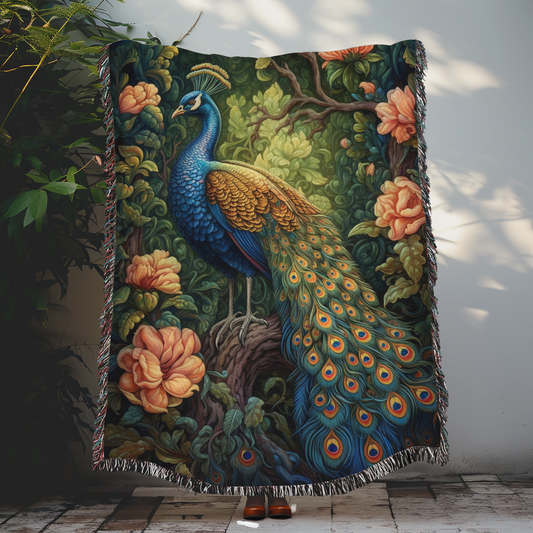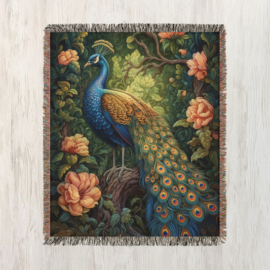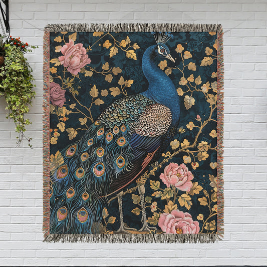 Art Deco Peacock William Morris Inspired Woven Blanket, Cozy Fall Home Decor Cotton Blanket