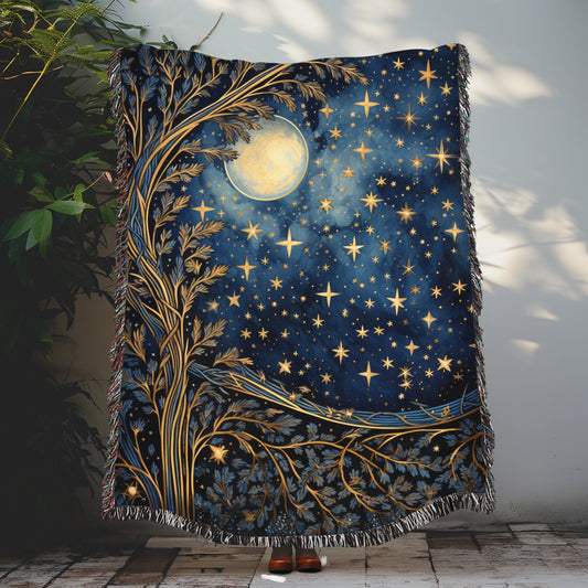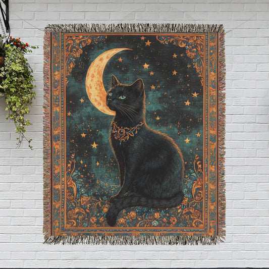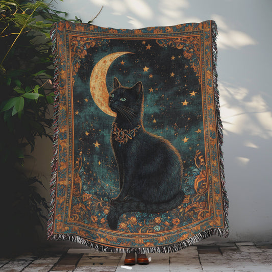 Black Cat Crescent Moon And Stars Woven Blankets, Cozy Home Decor, William Morris Inspired Cotton Blankets