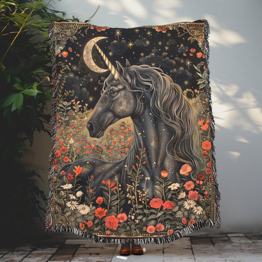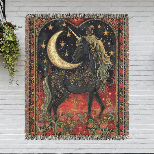 Victorian Black Unicorn Crescent Moon Stars Art Woven Blanket, William Morris Style - Home Decor Gift, Cozy Throw, Bedspread, Wall Tapestry