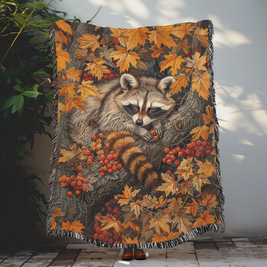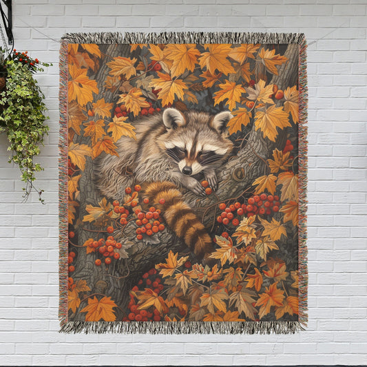 William Morris Inspired Sleeping Raccoon Forest Fall Leaves Woven Blanket, Home Decor Gift, Cozy Throw, Bedspread, Wall Tapestry