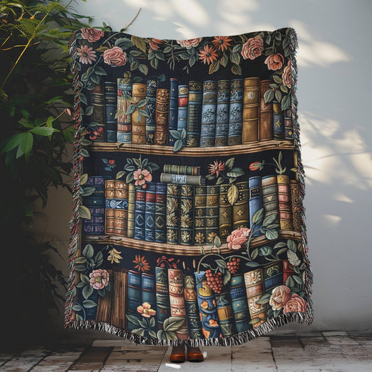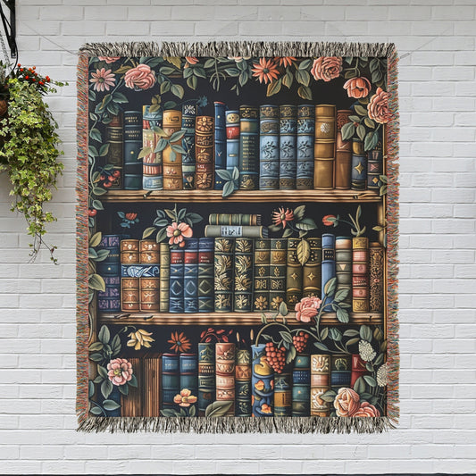 William Morris Inspired Vintage Bookshelf Botanical Woven Blanket, Gift For Reader Person Tapestry, Boho Room Decor Woven Wall Art