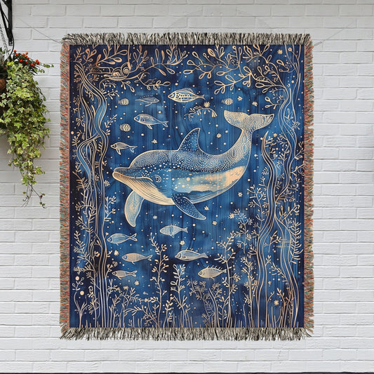 Indigo Ink Dolphin Pattern Woven Blanket, Cozy Home Decor Jacquard Cotton Throw, Bedding Blanket, Beach Picnic Wrap, Animal Lover Gift