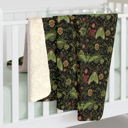 Embroidered Green Luna Moth Sherpa Blanket, William Morris Floral Pattern, Cozy Throw, Unique Home Decor, Gift for Nature Lover, Holiday