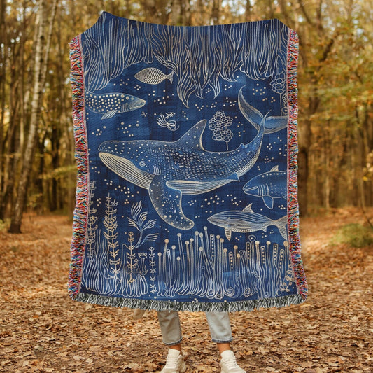 Indigo Ink Whale Shark Pattern Woven Blanket, Cozy Home Decor Jacquard Cotton Woven Blanket