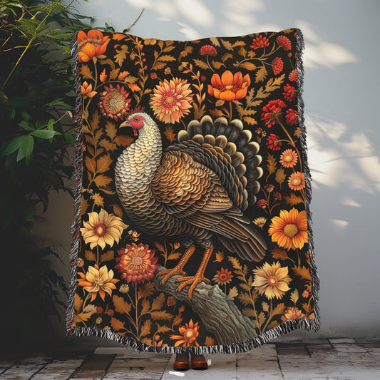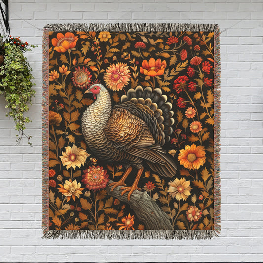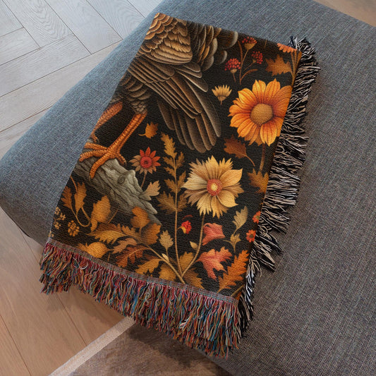William Morris Inspired Thanksgiving Turkey Woven Cotton Blanket, Autumn Harvest Floral Throw