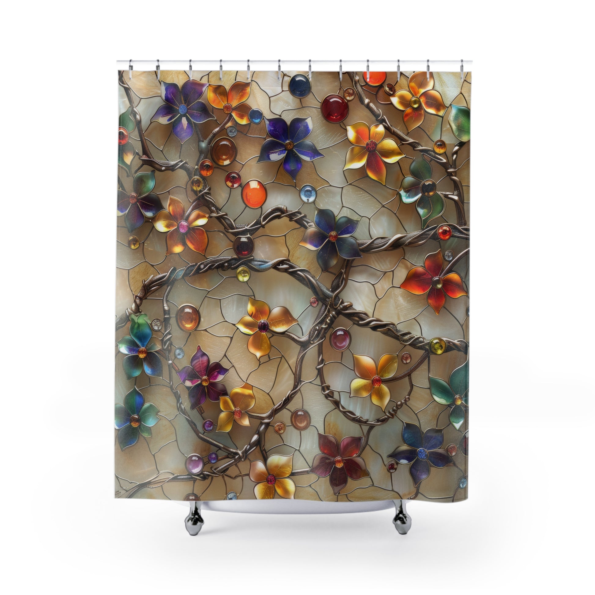 3D Stained Glass Colorful Jewelry Fall Flowers Polyester Shower Curtain