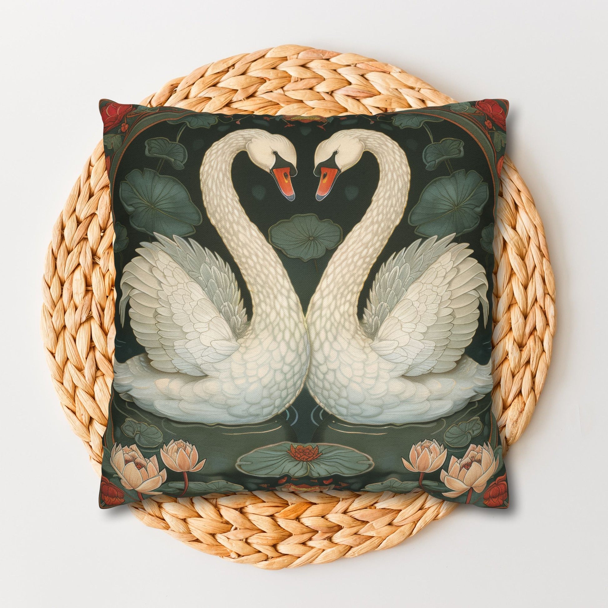 This decorative pillow features an Art Nouveau design with white swans and lotus flowers, inspired by the works of William Morris. It adds a touch of elegance and vintage charm to any living space. Perfect for those who appreciate art history and intricate patterns. Ideal for home decor, gift-giving, and special occasions like Mother's Day or housewarming parties. This pillow is constructed from premium materials, the cover is soft to the touch and easy to care for, soft cozy insert is included. Made from spun polyester threads, it retains its shape, doesn't wrinkle, and doesn't require ironing. 100% Polyester pillow insert made from recycled polyester, these inserts are three inches larger than their cover, providing the pillow with extra volume. Care Instructions: Remove the pillow cover. Pre-treat the stains with soft cloth or bristle brush that had been soaked in warm soapy water. Machine wash, max 40°C (104°F), normal cycle. Do not bleach, tumble dry on low, do not dry-clean. Iron, steam, or dry low heat only. Fluff to reshape when assembling it back together.