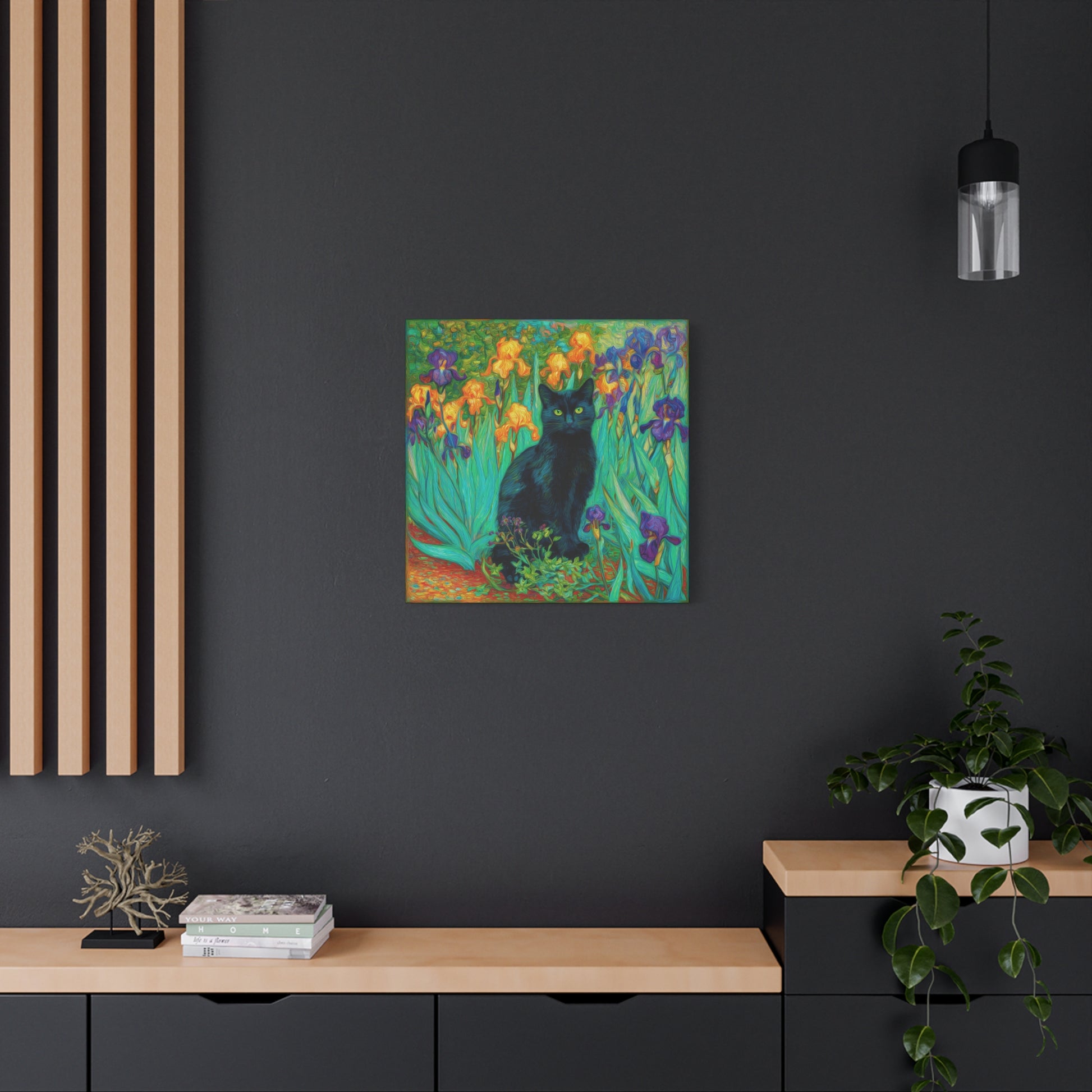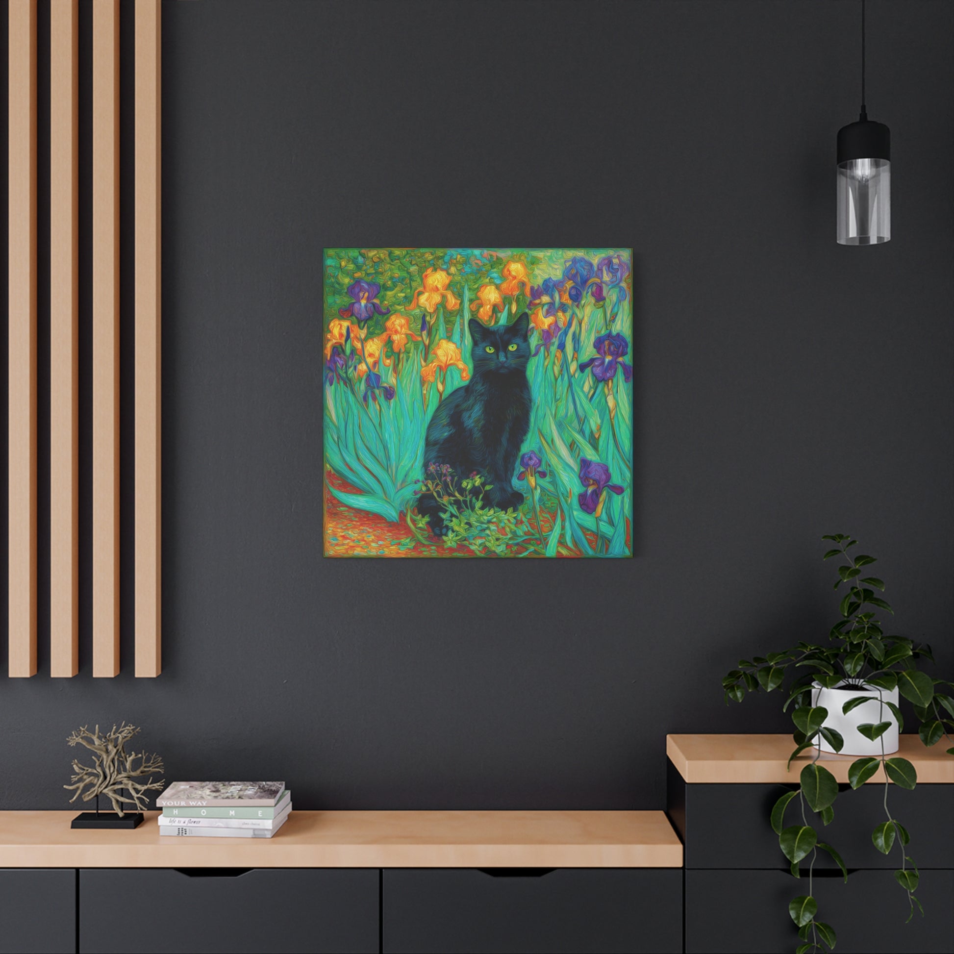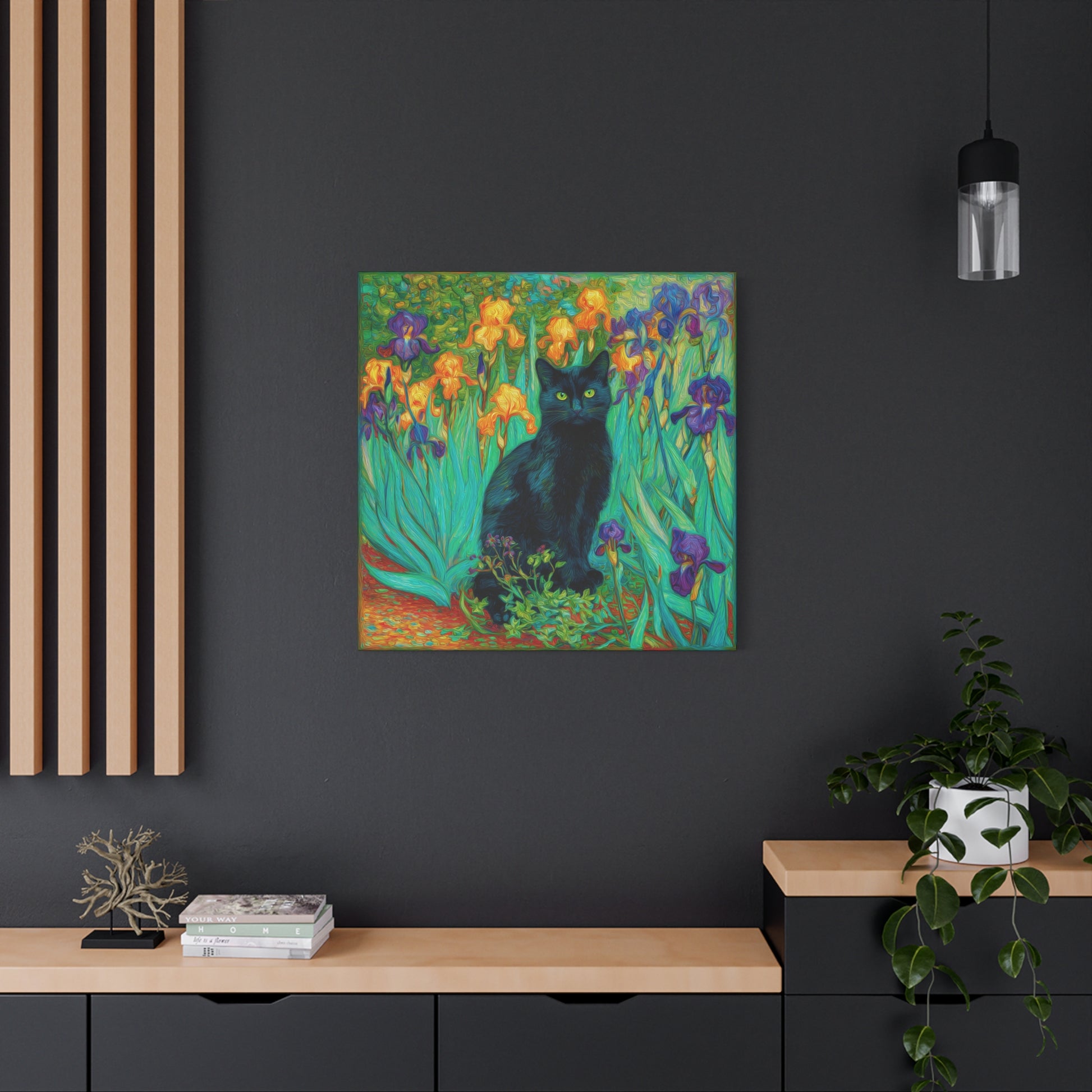 🐈⬛ black cat wall art 🌸 iris flower canvas 🎨 impressionist style print 🛋️ living room decor 🌿 botanical wall art 🖼️ cat lover gift decor 🌼 colorful floral painting ✨ whimsical canvas art 🌺 modern nature artwork 🎁 gift for cat lovers 🌌 vibrant home decor 🌻 floral boho canvas 🐾 mystical cat artwork