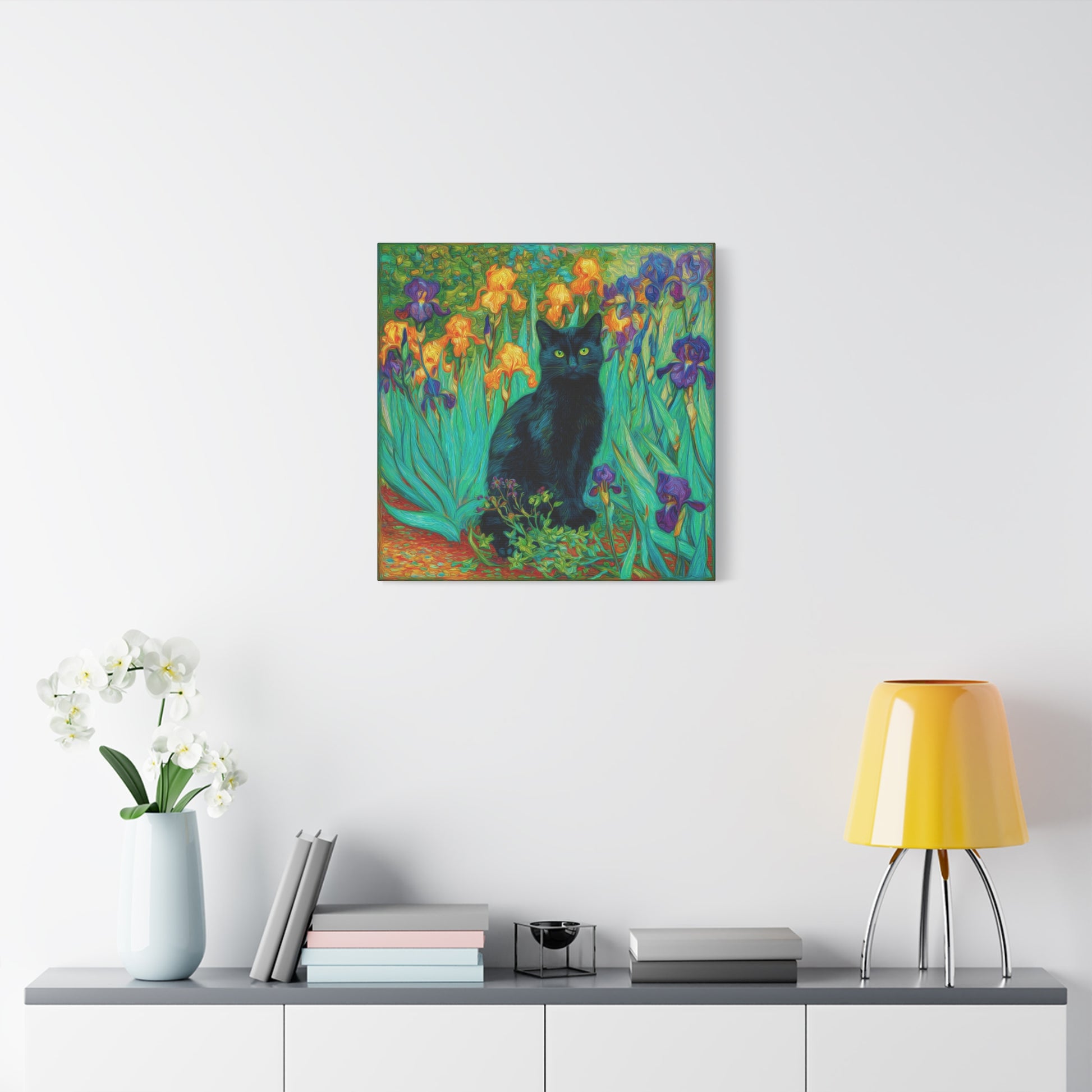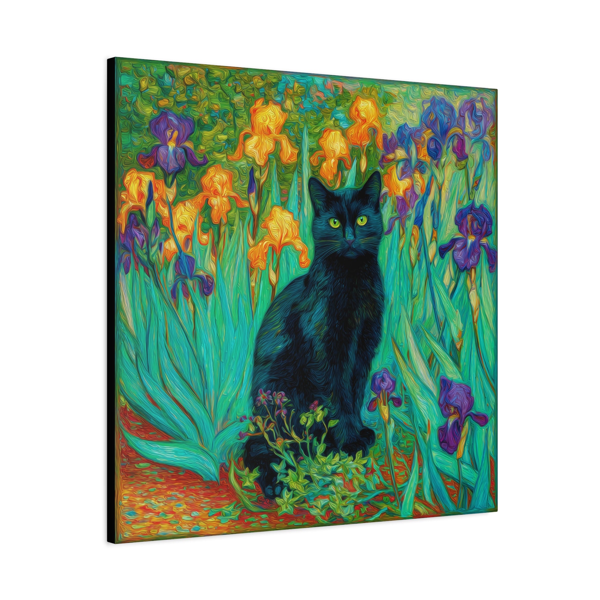 Bring an artistic touch of mystery and elegance into your home with this Black Cat Among Irises Canvas Wall Art. Featuring a sleek black cat with striking green eyes surrounded by vivid purple, yellow, and orange irises, this piece exudes both charm and sophistication. The swirling, painterly strokes create a timeless impressionist-inspired look that draws the eye and enriches any room.