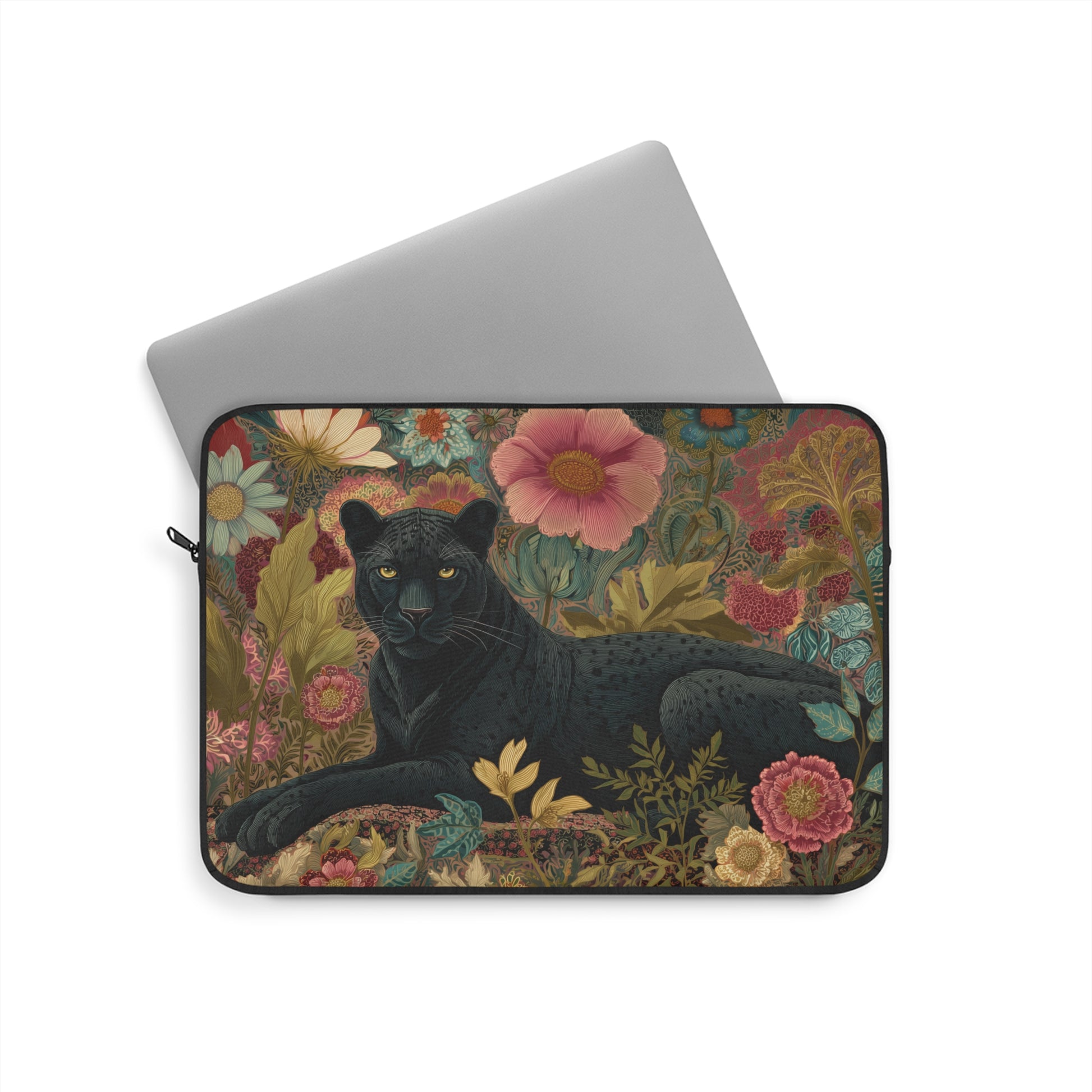 🌺 Product Features * 💻 Available Sizes: 12”, 13”, and 15” * 🧵 Material: 100% polyester – durable, lightweight, and easy to clean * ⚡ Durable zipper closure with sleek metal head for smooth use * ☁️ Soft plush fleece lining provides a snug, scratch-free fit * 🛡️ Foam padding protects from dust, scratches, and minor bumps * 🖤 Elegant black polyester back for a polished, modern look * 🌸 High-quality print showcasing every floral detail and the panther’s graceful form