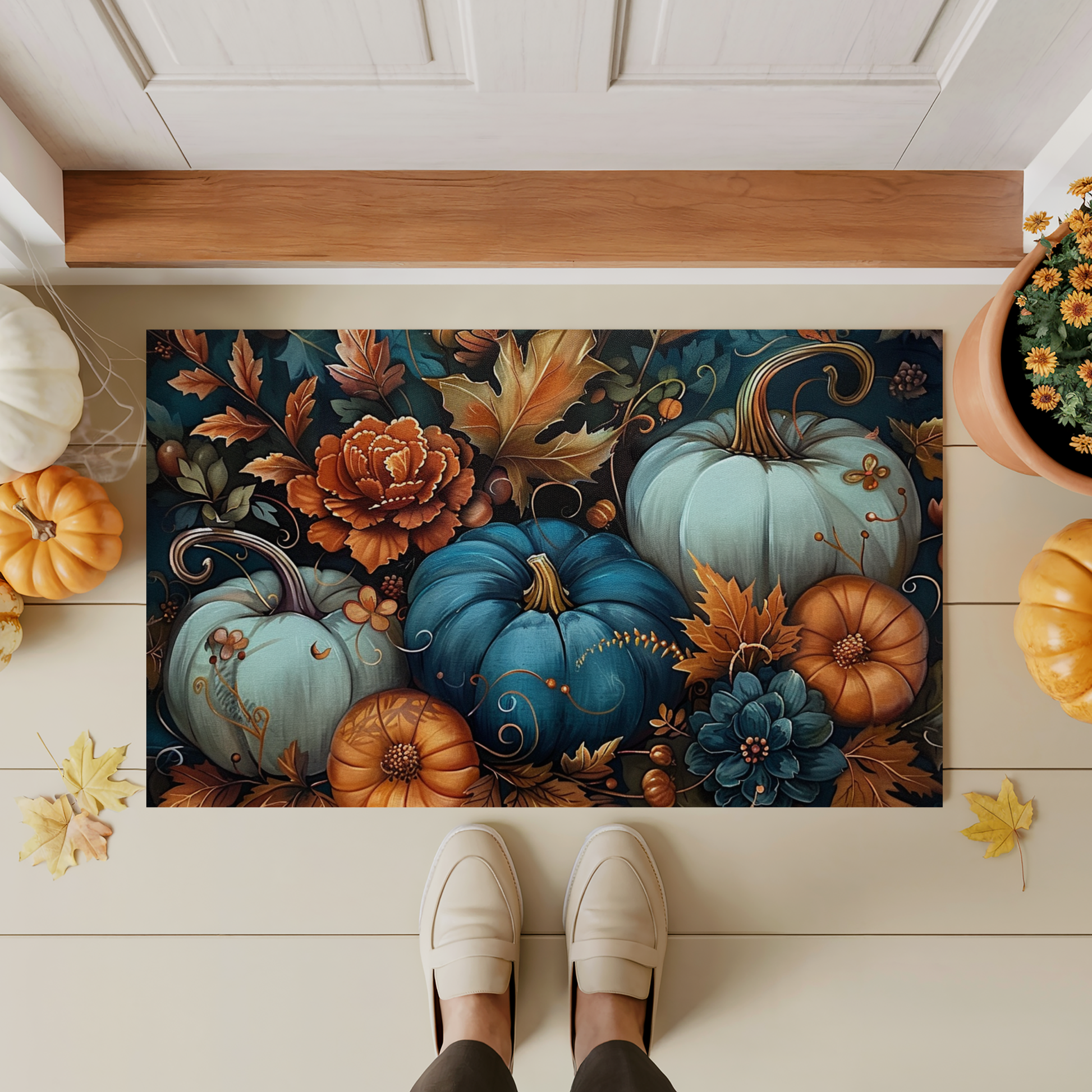 Add a touch of rustic elegance to your entryway with our Teal Pumpkin Doormat, featuring a striking design that captures the beauty of fall. The artwork highlights a rich mix of teal and orange pumpkins surrounded by autumn leaves and florals, creating a unique seasonal statement that feels both cozy and sophisticated.