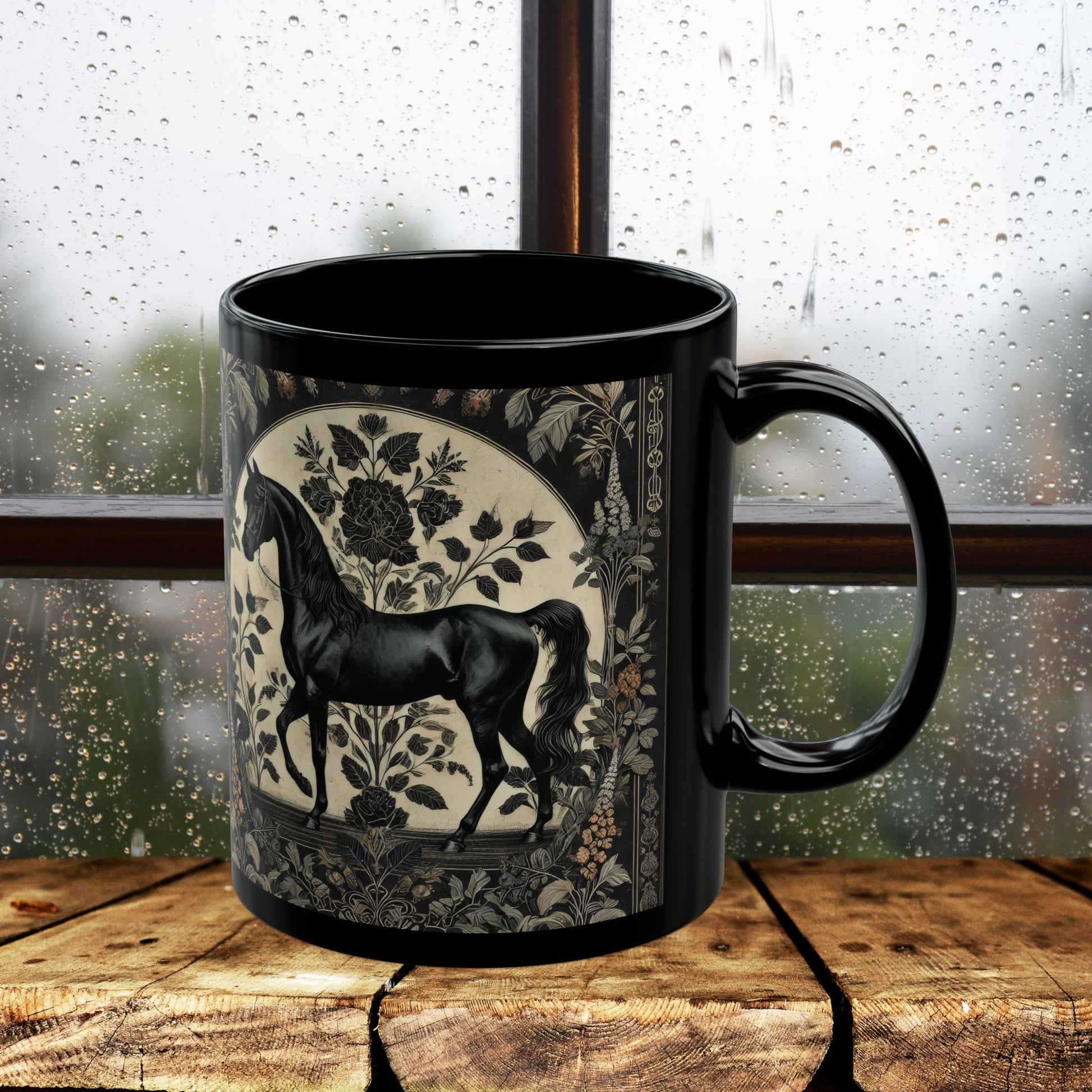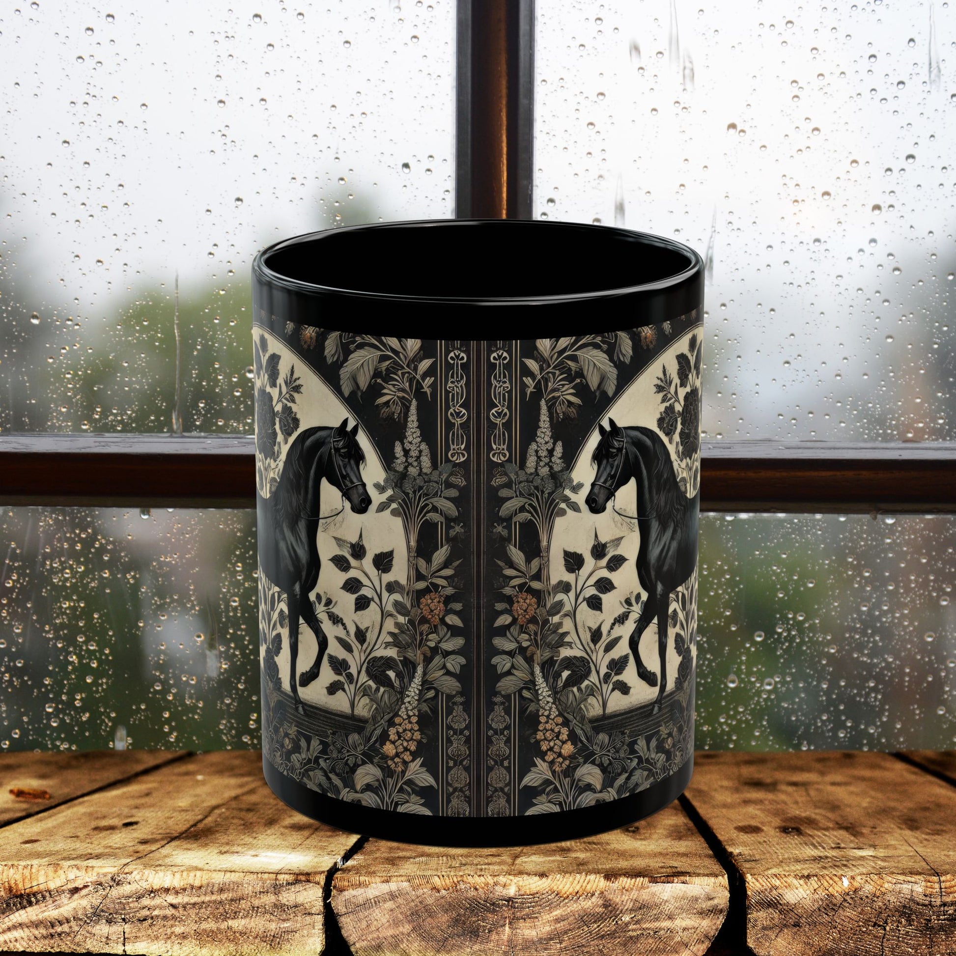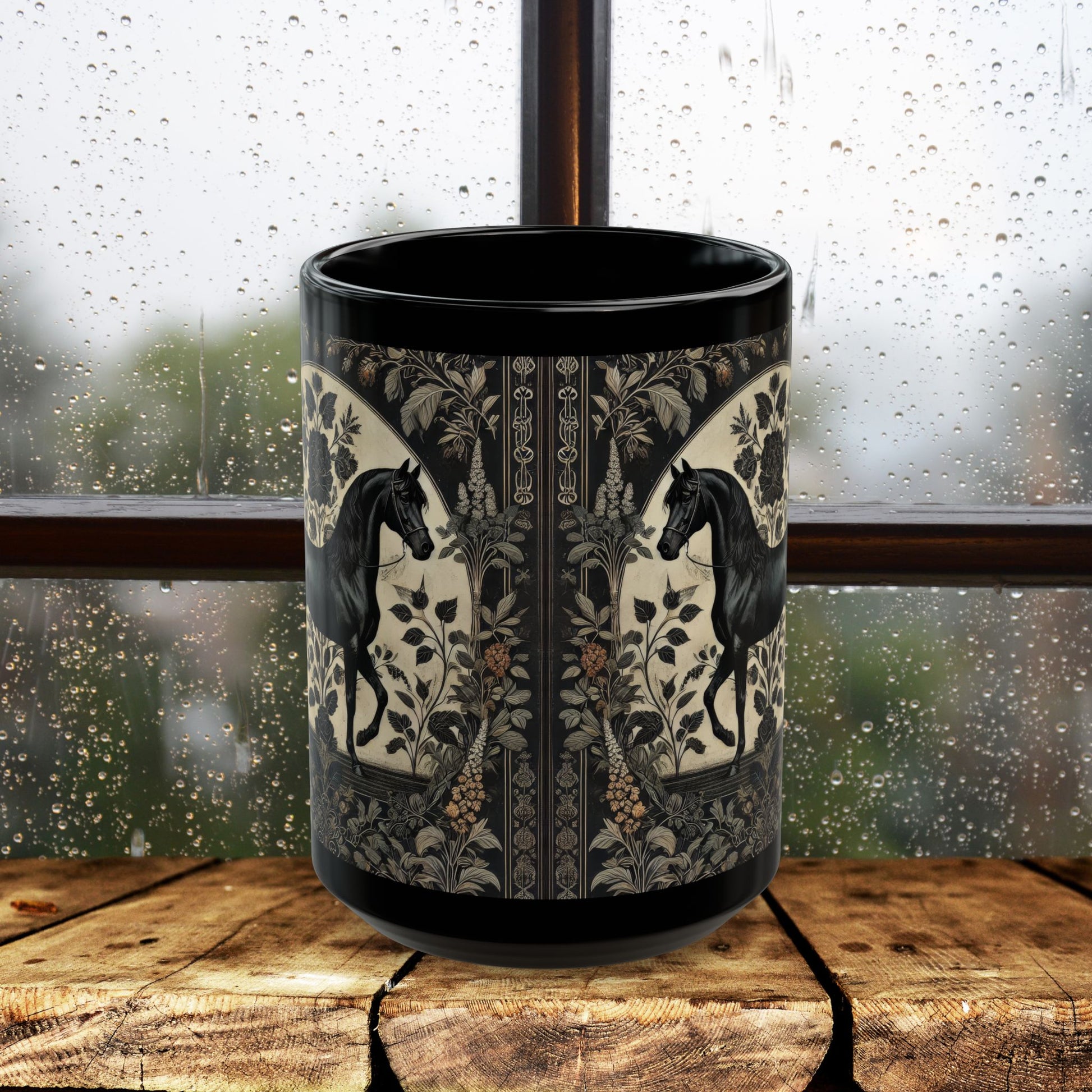 Botanicals Arabian Black Horse Coffee Mug โ William Morris Inspired Equestrian Floral Black Ceramic Cup (11oz/15oz)