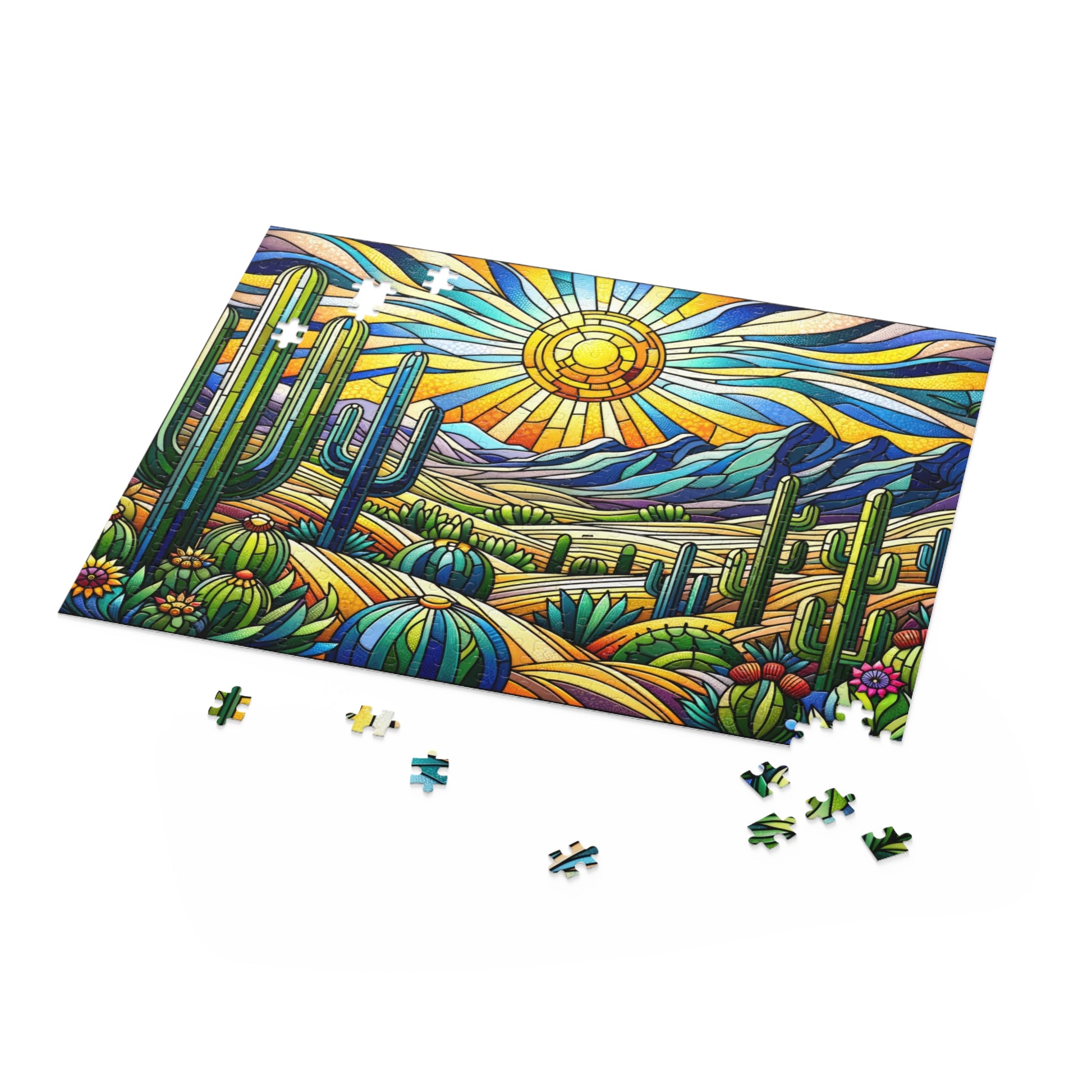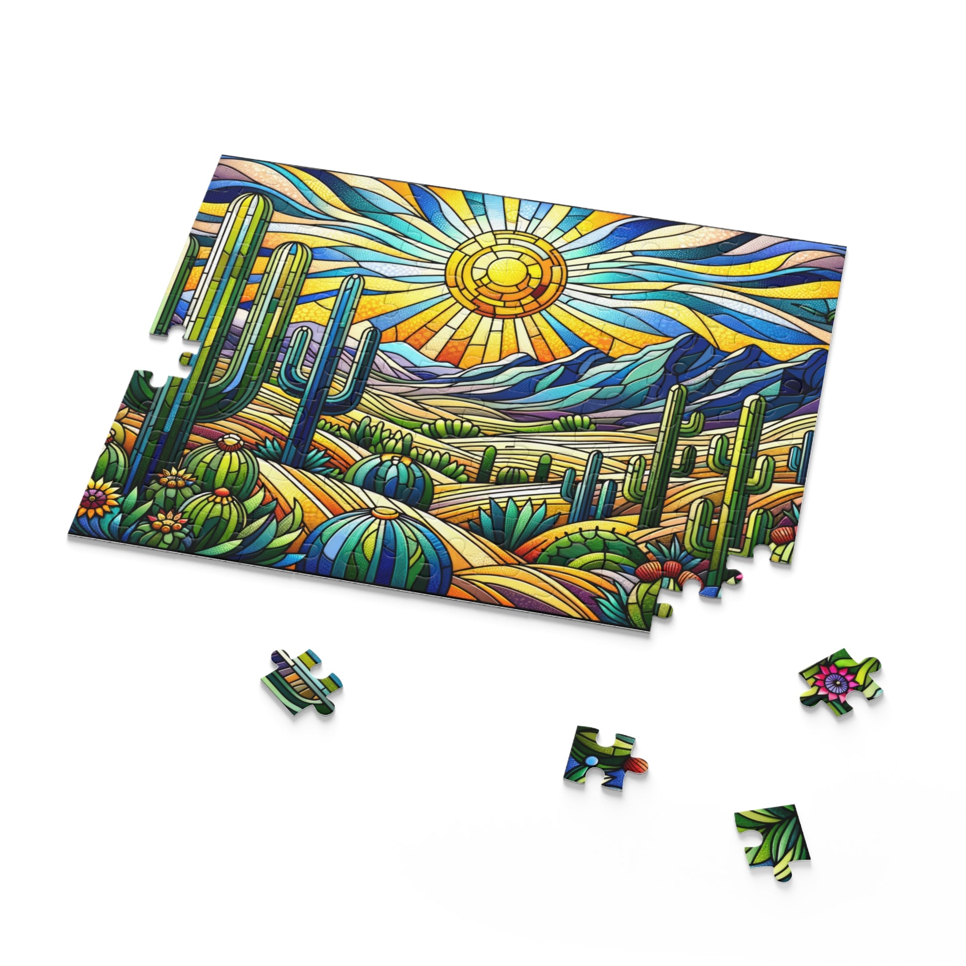 Cactus Dessert Scene Stained Glass Jigsaw Puzzle Box (120, 252, 500-Piece) Adult Jigsaw Puzzle, Gift Him Her