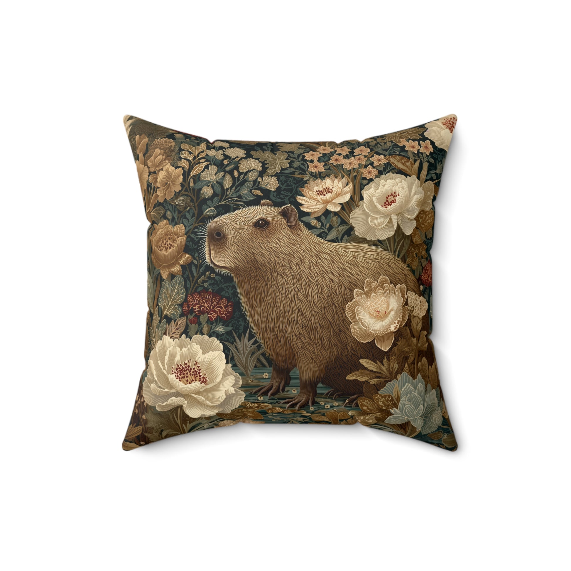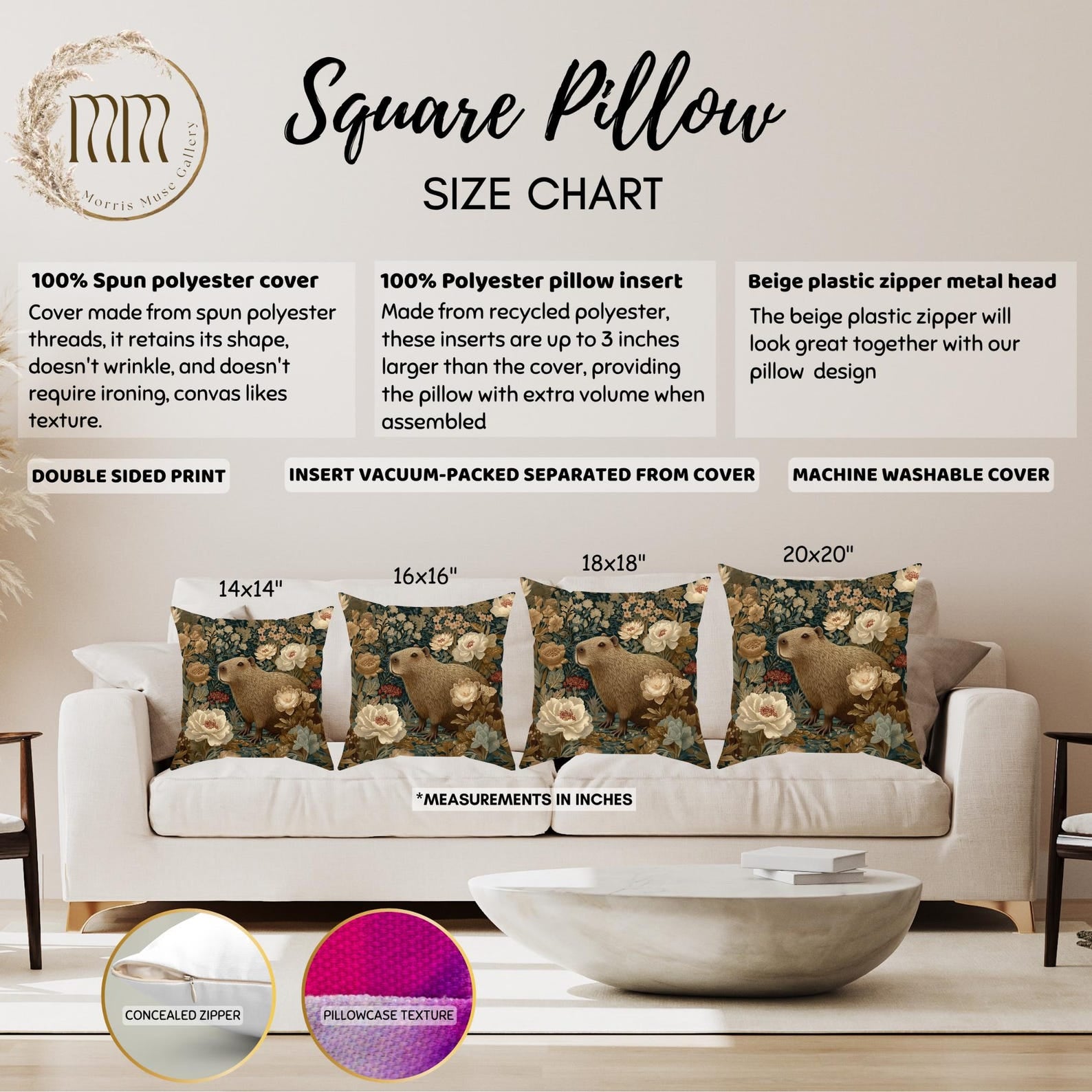 Product Description Bring cozy woodland charm into your home with this beautifully illustrated capybara pillow. Inspired by William Morris’ timeless botanical patterns, the design features a gentle capybara surrounded by lush vintage florals in warm sepia, cream, soft gold, and muted forest tones. Every petal and every strand of fur is intricately detailed, giving the pillow an elegant tapestry-like appearance that enriches any space. Made with a durable spun polyester cover, this pillow maintains crisp color, resists wrinkles, and keeps its shape beautifully over time. The double-sided print ensures that the artwork is visible from every angle, whether placed on a sofa, bed, reading nook, or accent chair. Choose from the cover alone, the cover with a plush recycled polyester insert, or the outdoor pillow version designed specifically to handle weather and sunlight. A perfect gift for nature lovers, cottagecore enthusiasts, botanical décor fans, or anyone who enjoys whimsical woodland art. Features * 100% spun polyester cover for vibrant, long-lasting color * Double-sided print showcasing the full artwork * Hidden beige zipper with smooth metal pull * Insert option: 100% recycled polyester insert for a plush, full silhouette * Outdoor pillow option (water- and UV-resistant materials) * Ships unassembled to reduce creasing during delivery and protect the print Care Instructions * Remove pillow cover before washing * Pre-treat stains with warm soapy water * Machine wash gentle, max 40°C / 104°F * Do not bleach * Tumble dry low * Do not dry-clean * Iron or steam on low heat if needed * Fluff once reassembled for best shape