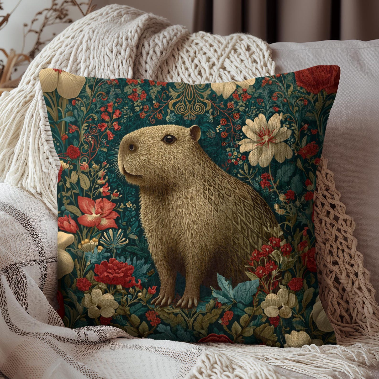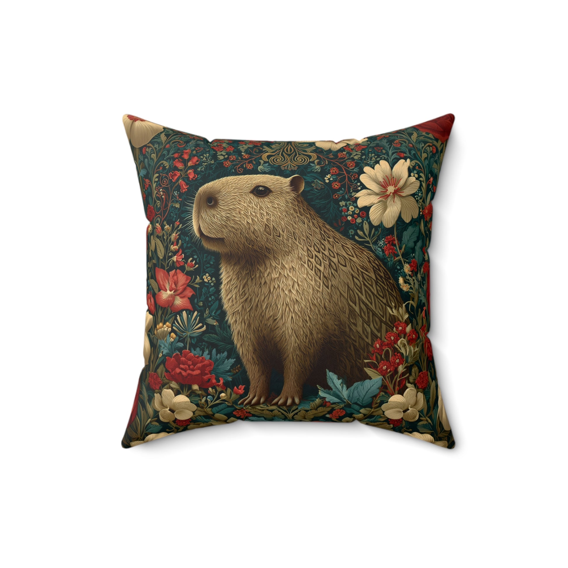 Product Description Add whimsical woodland charm to your home with this beautifully illustrated Capybara Floral Pillow, inspired by the lush botanical patterns of William Morris. This gentle capybara stands surrounded by richly layered flowers in warm reds, soft creams, and muted greens, all set against a deep teal backdrop that gives the design a vintage tapestry feel. Every detail—from the delicate linework in the florals to the textured fur pattern on the capybara—creates a sense of depth, warmth, and storybook elegance. The double-sided spun polyester cover ensures crisp, vibrant printing that resists fading, wrinkling, and stretching. Choose the cover alone, pair it with an oversized recycled polyester insert for a plush, full silhouette, or opt for the outdoor pillow version perfect for patios, porches, and cozy garden seating. Perfect for capybara lovers, cottagecore enthusiasts, botanical décor fans, and anyone seeking a standout decorative accent with a blend of whimsy and sophistication.