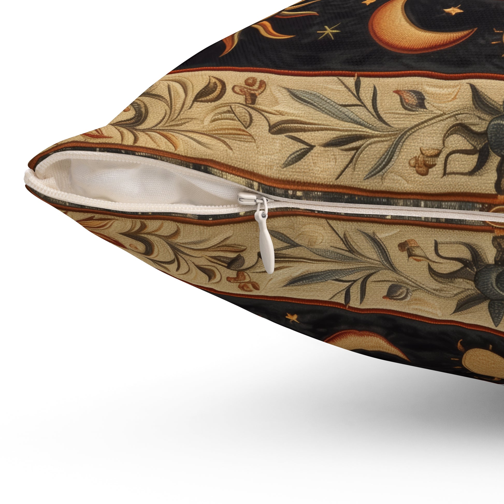 The intricate gold, bronze, and cream tones are set against a deep midnight background adorned with stars and floral motifs, evoking the elegance of vintage tapestry art. This pillow is more than just decor — it’s a statement piece that transforms any room into a space of warmth, beauty, and serenity.