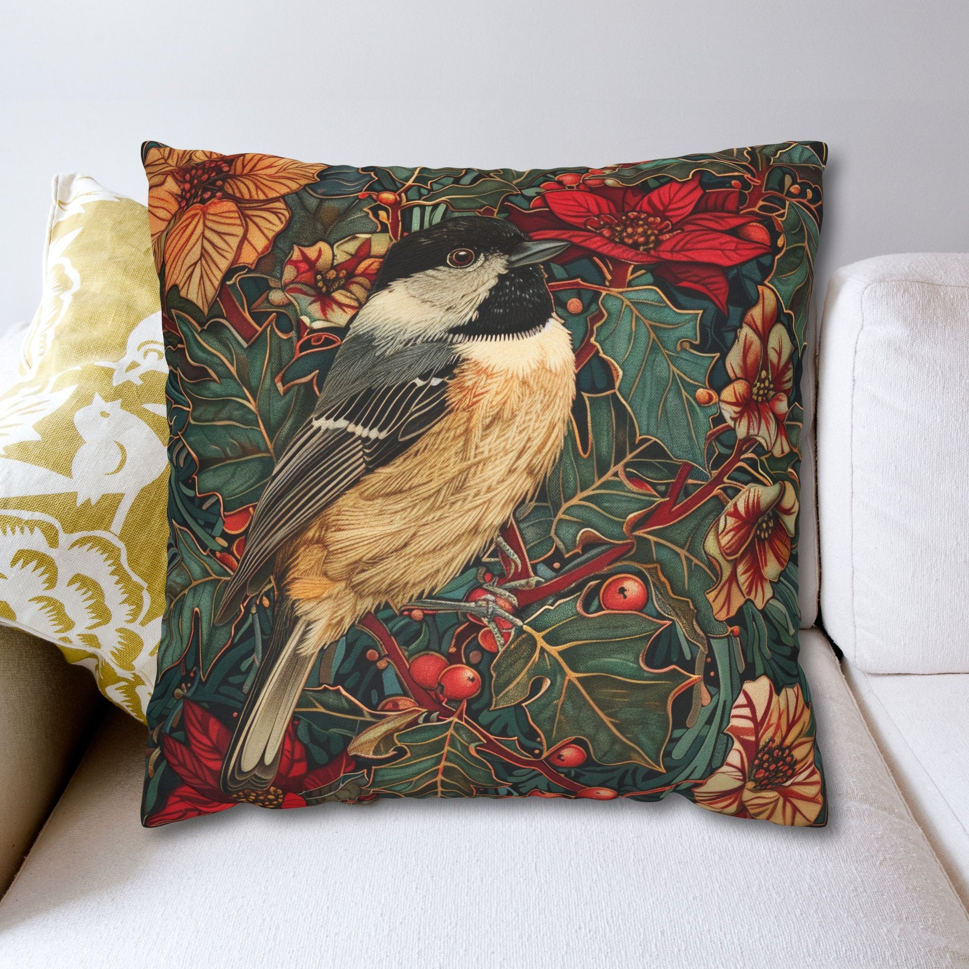 Charming Chickadee With Winter Flowers Decorative Pillow, vintage home decor. This spun polyester square pillow features a cozy and nostalgic design, perfect for adding a touch of winter charm to any room. Ideal for bird lovers and those who appreciate vintage aesthetics. Relevant for the winter season, Christmas, and home decor enthusiasts.