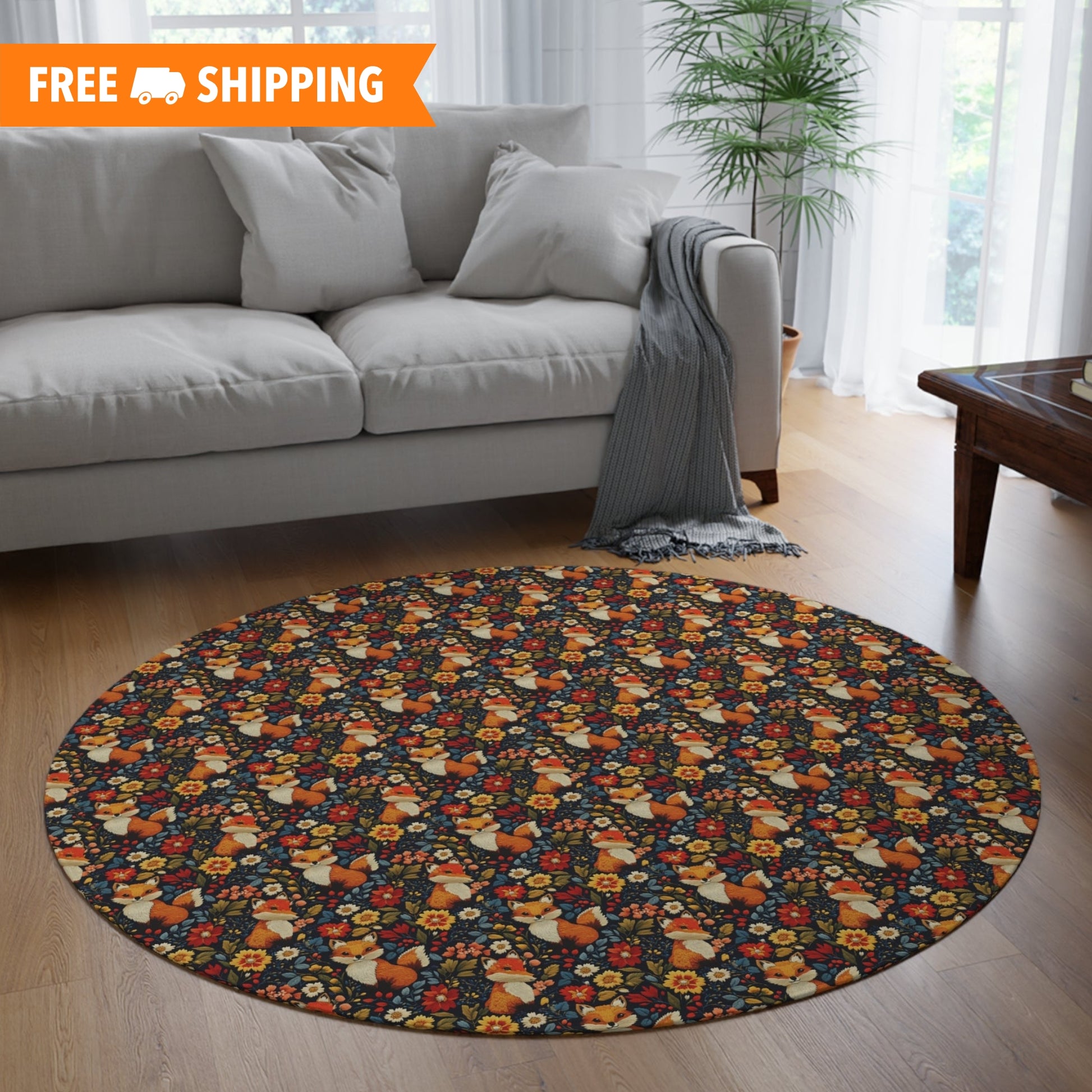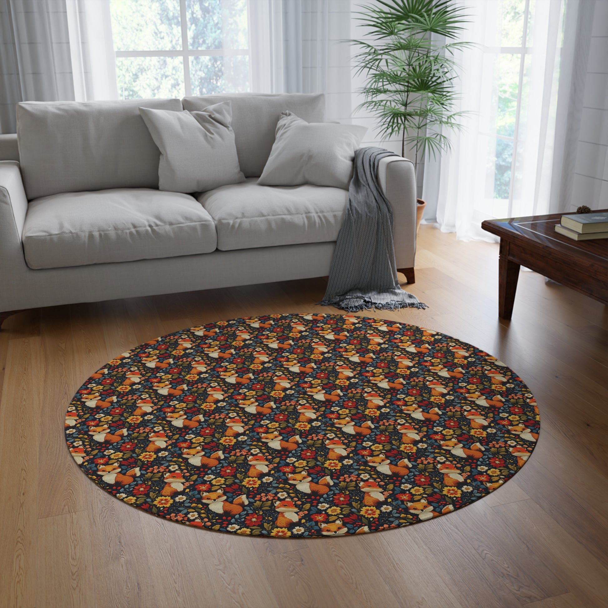 Embroidered Cute Foxes Round Rug, Fall Season Decor Carpet, Floral Pattern Area Rug