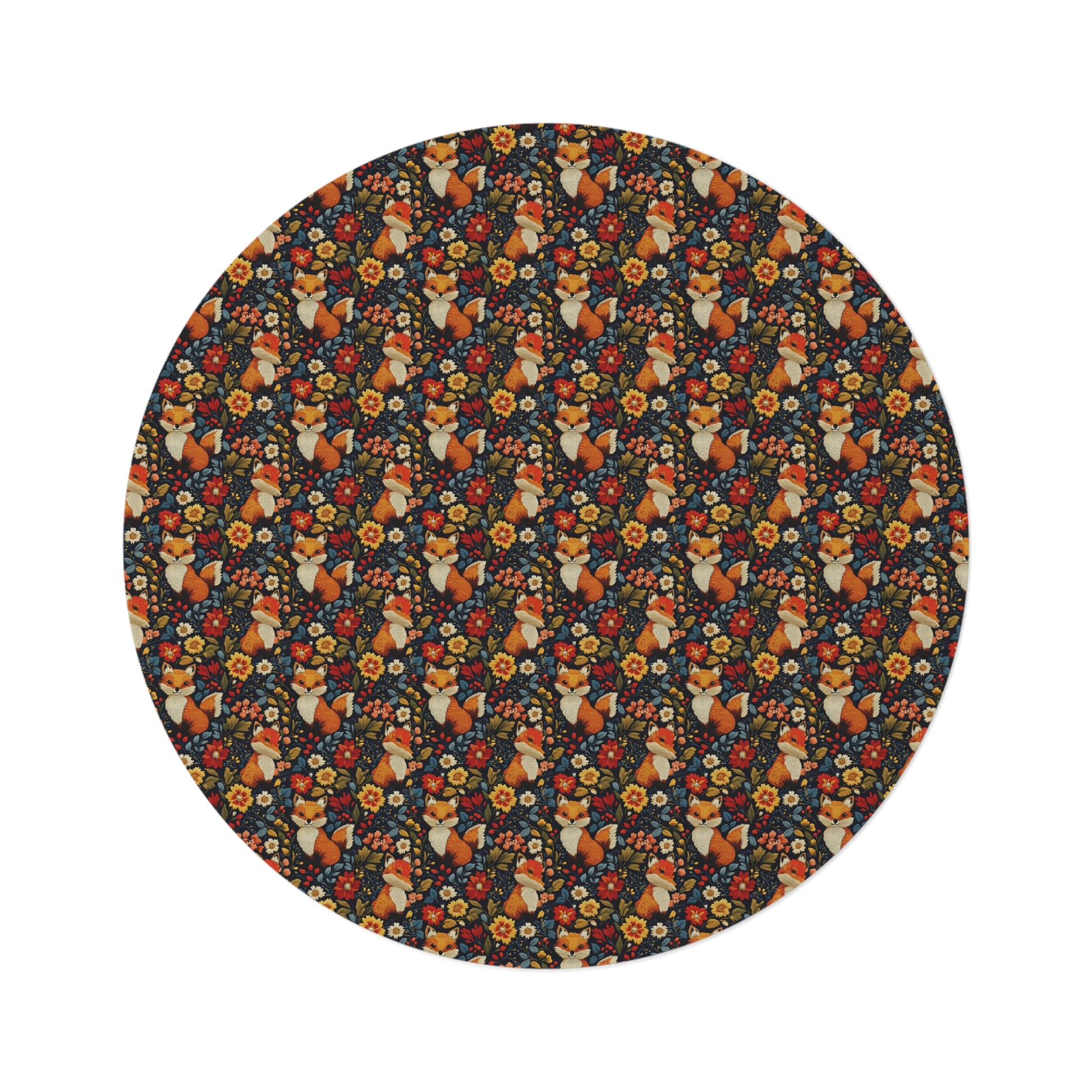 Add a touch of coziness and charm to your home with this Embroidered Cute Foxes Fall Florals Pattern Round Rug. Perfect for the fall season, this rug features vibrant colors and adorable foxes amongst fall florals, creating a warm and inviting atmosphere. Ideal for those who love autumn decor and want to bring a touch of nature indoors.