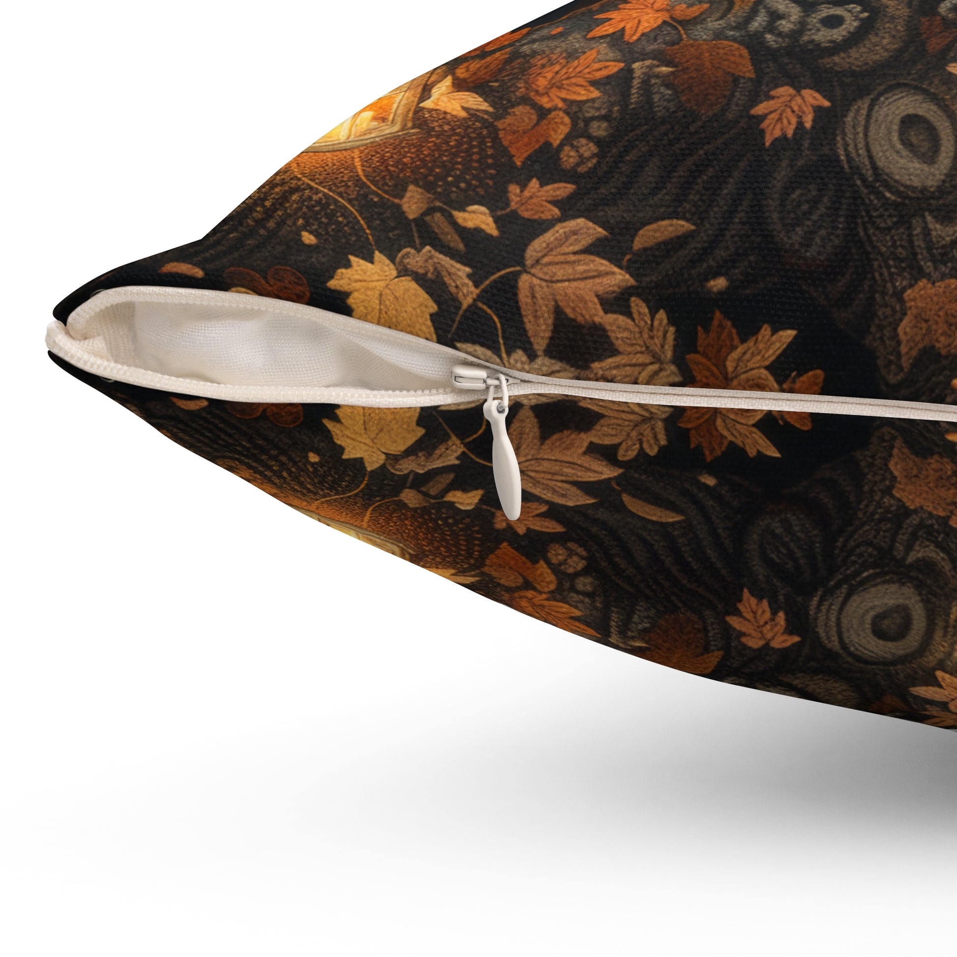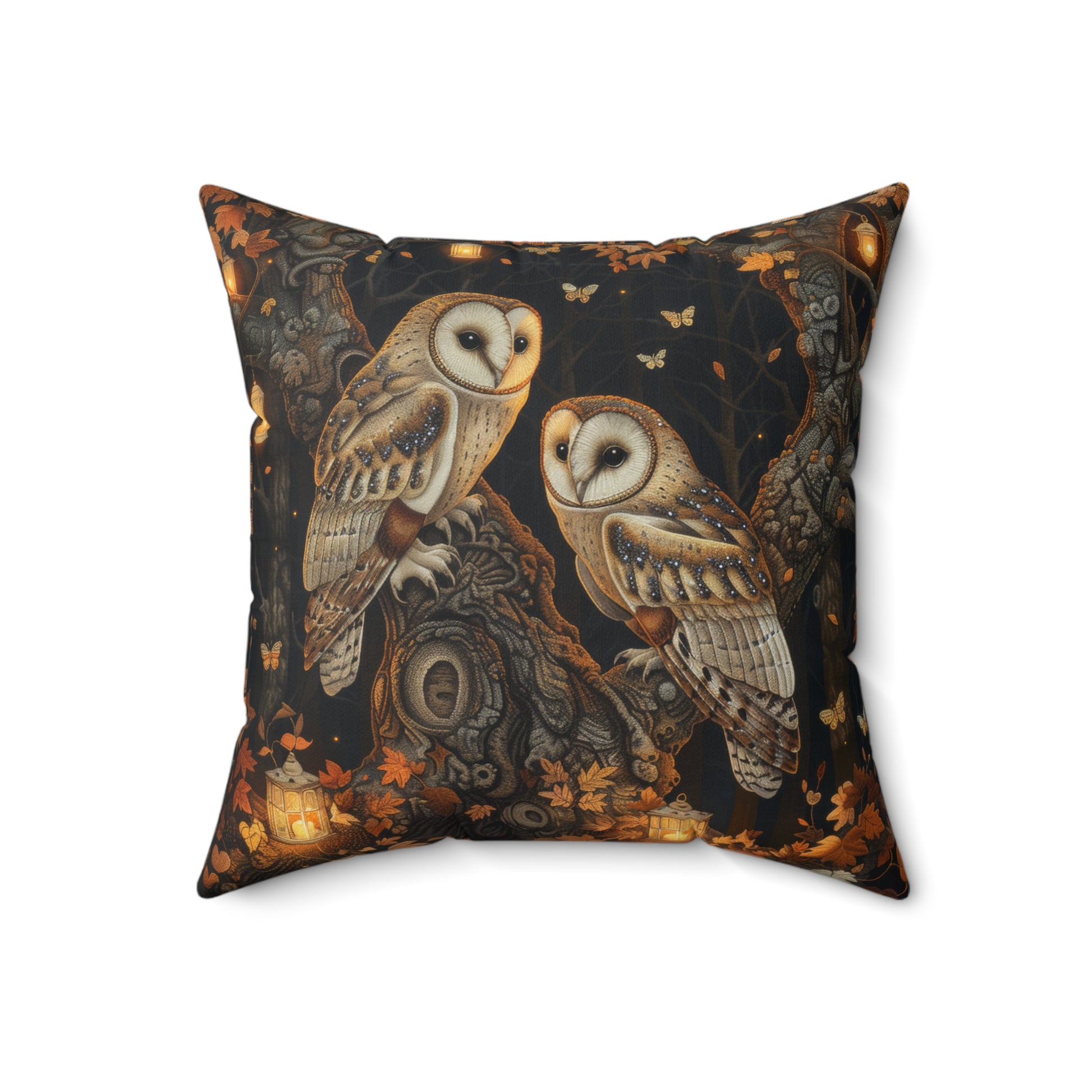 This decorative fall pillow features a design of owls in an enchanted forest inspired by William Morris. Perfect for adding a touch of nature and whimsy to your home decor. Ideal for those who appreciate intricate patterns and the beauty of fall. Relevant for Halloween, Thanksgiving, and autumn decor.