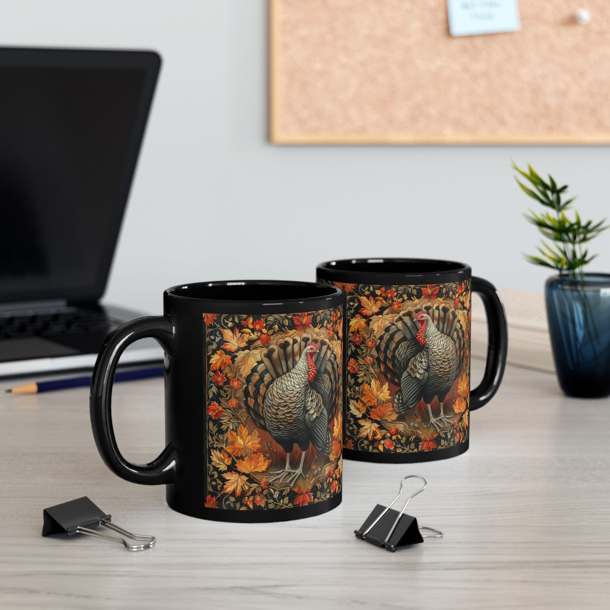 Fall Turkey William Morris Inspired Black Coffee Mug For Her Him Ceramic Mug Black Mug 11oz, 15oz