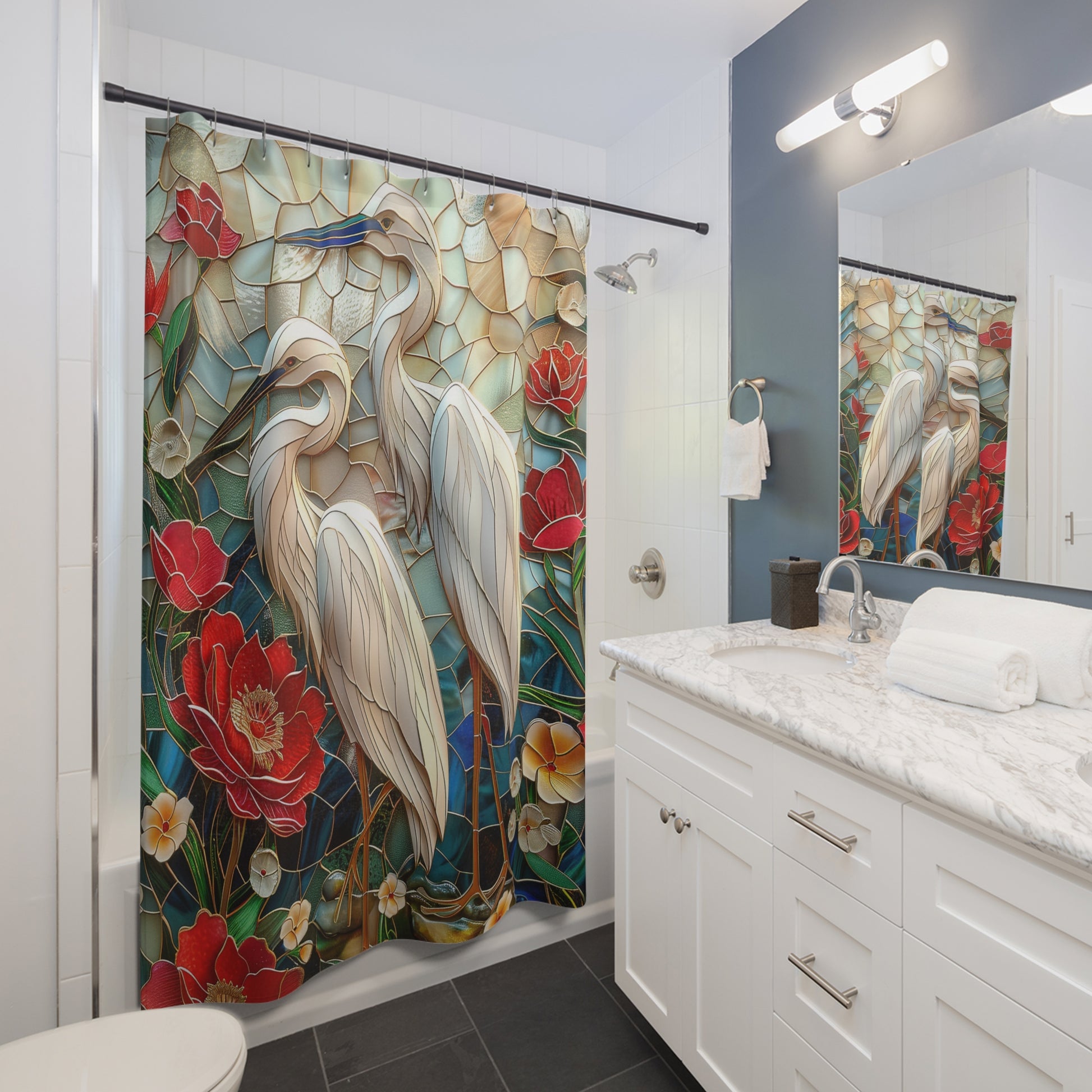 Faux Stained Glass Great White Heron Red Flowers Polyester Shower Curtain