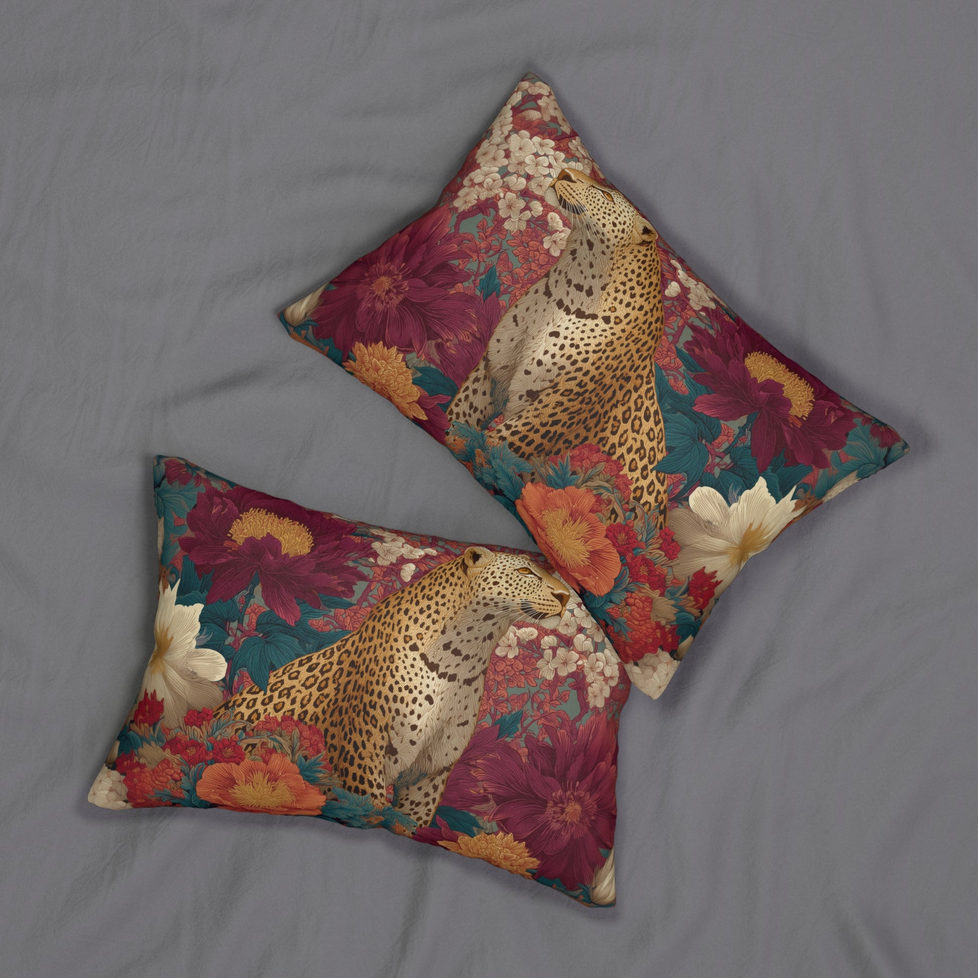 Transform your living space with this vibrant lumbar pillow, featuring a stunning floral backdrop and a majestic cheetah at the center. The combination of lush botanical blooms in jewel-toned colors with the powerful elegance of the cheetah makes this pillow a statement piece for any room.