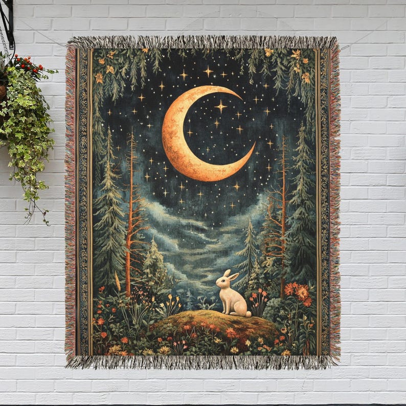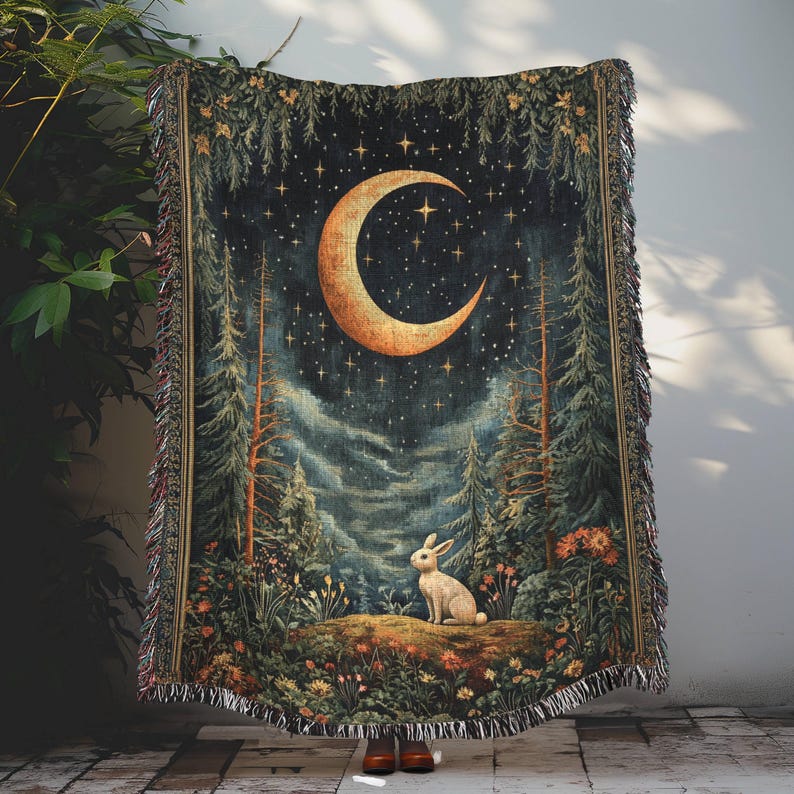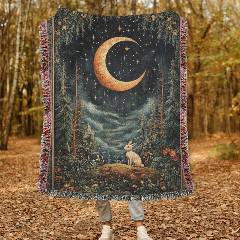 Forestcore Rabbit Crescent Moon William Morris Inspired Jacquard Woven Blankets