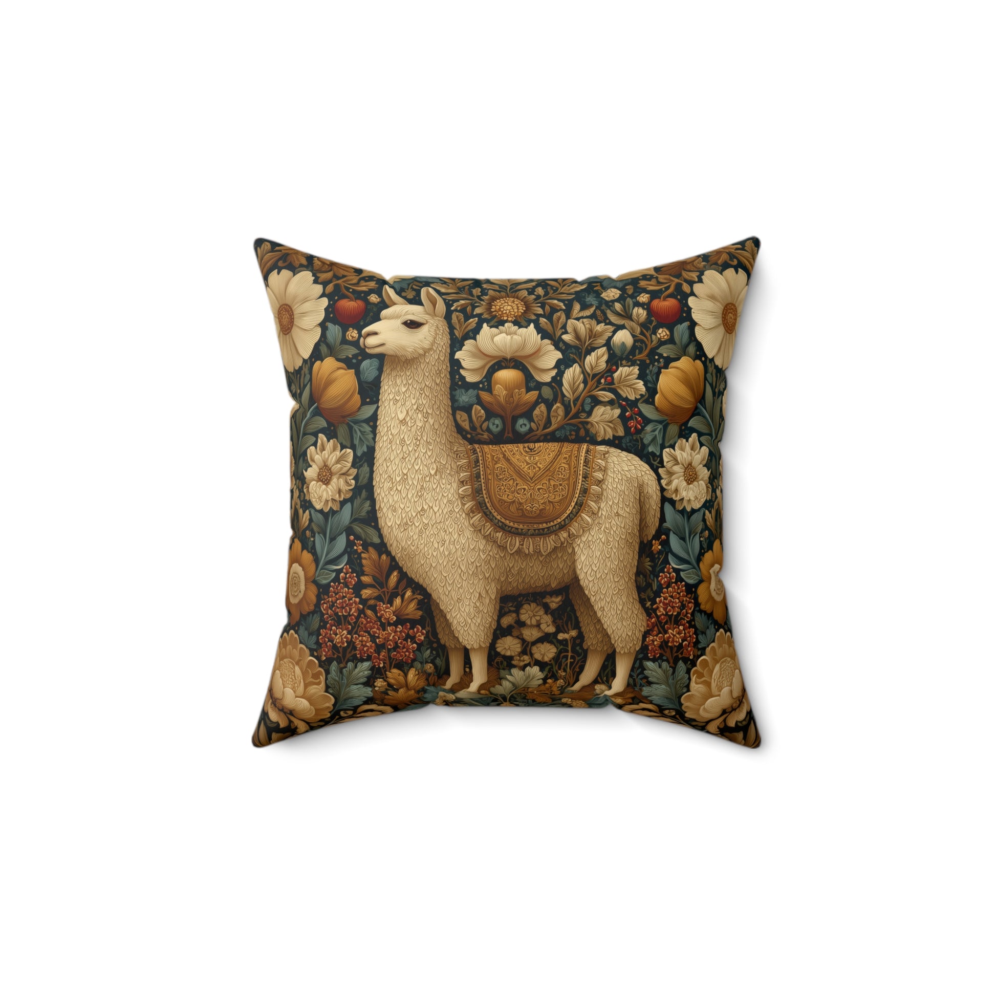 Product Description Bring refined woodland charm into your home with this exquisite Golden Alpaca Floral Pillow, inspired by the lush botanical patterns of William Morris. The beautifully detailed alpaca stands surrounded by blooming florals in soft gold, cream, amber, and muted teal tones. Every petal, leaf, and fur texture is illustrated with tapestry-like precision, giving the piece an elegant, old-world richness. Crafted with a durable spun polyester cover, this pillow maintains crisp color, sharp detailing, and excellent shape retention. The artwork is printed on both sides for a stunning 360-degree display. Choose the cover alone, the cover with a plush recycled polyester insert for maximum fullness, or the outdoor pillow option—perfect for patios, porches, and cottage-style garden corners. This pillow adds warmth and sophistication to any interior and is ideal for alpaca lovers, botanical décor fans, boho and cottagecore homes, or anyone who loves richly detailed art.