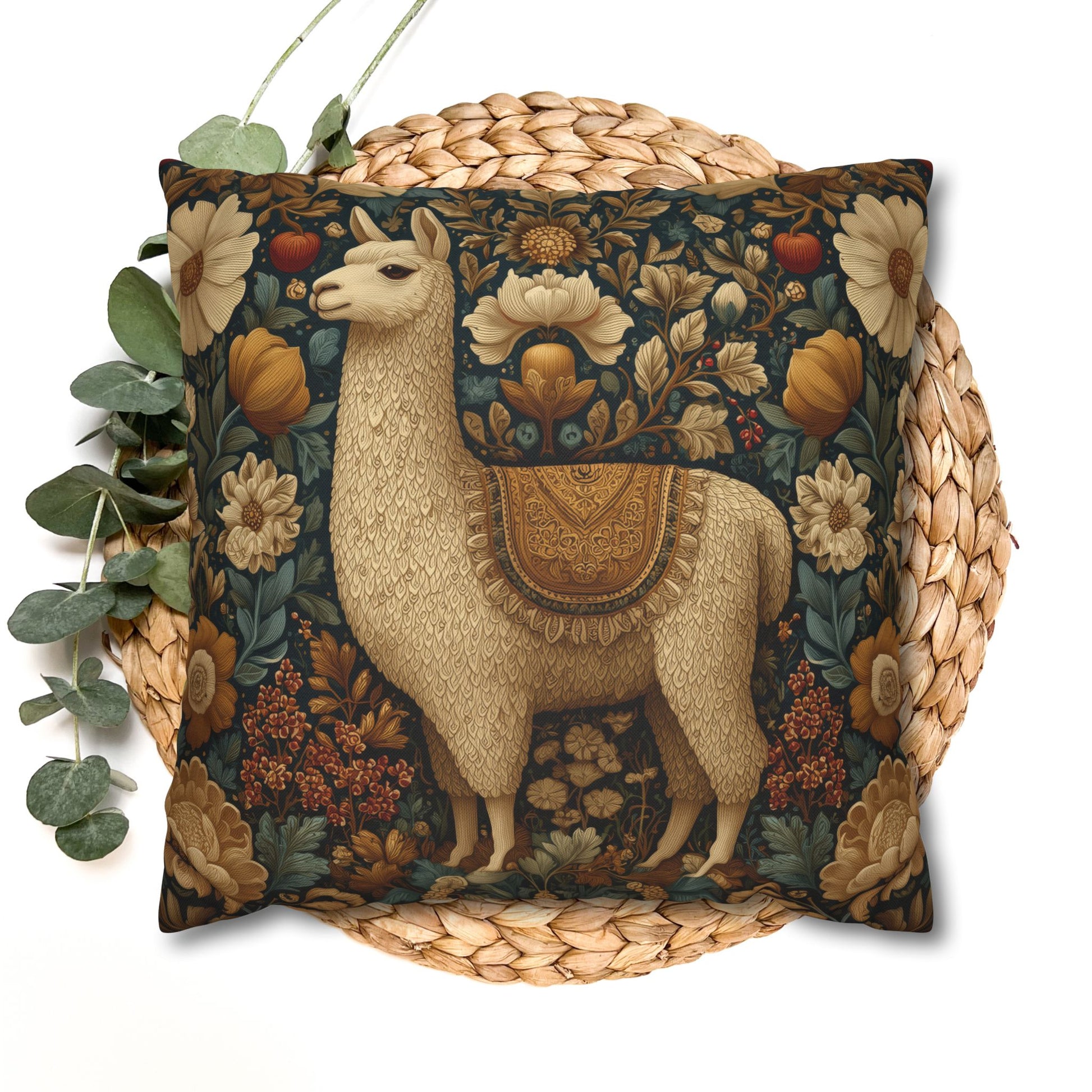 Product Description Bring refined woodland charm into your home with this exquisite Golden Alpaca Floral Pillow, inspired by the lush botanical patterns of William Morris. The beautifully detailed alpaca stands surrounded by blooming florals in soft gold, cream, amber, and muted teal tones. Every petal, leaf, and fur texture is illustrated with tapestry-like precision, giving the piece an elegant, old-world richness. Crafted with a durable spun polyester cover, this pillow maintains crisp color, sharp detailing, and excellent shape retention. The artwork is printed on both sides for a stunning 360-degree display. Choose the cover alone, the cover with a plush recycled polyester insert for maximum fullness, or the outdoor pillow option—perfect for patios, porches, and cottage-style garden corners. This pillow adds warmth and sophistication to any interior and is ideal for alpaca lovers, botanical décor fans, boho and cottagecore homes, or anyone who loves richly detailed art.